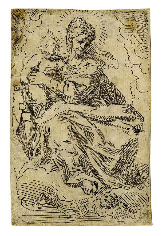 Simone Cantarini [attribuito a], La Vergine con il Bambino sulle nubi. Acquaforte. mm 130x85. Bartsch, 19. Bellini (Cantarini), 41. Opera attribuita non unanimemente al Cantarini sebbene la si trovi di solito inserita nel suo corpus grafico. Buona prova di questo foglio non comune, nell'unico stato e senza alcuna scritta, su carta vergellata sottile. Al verso marchio del Cooper Union Museum, New-York (Lugt, 457e). (1)