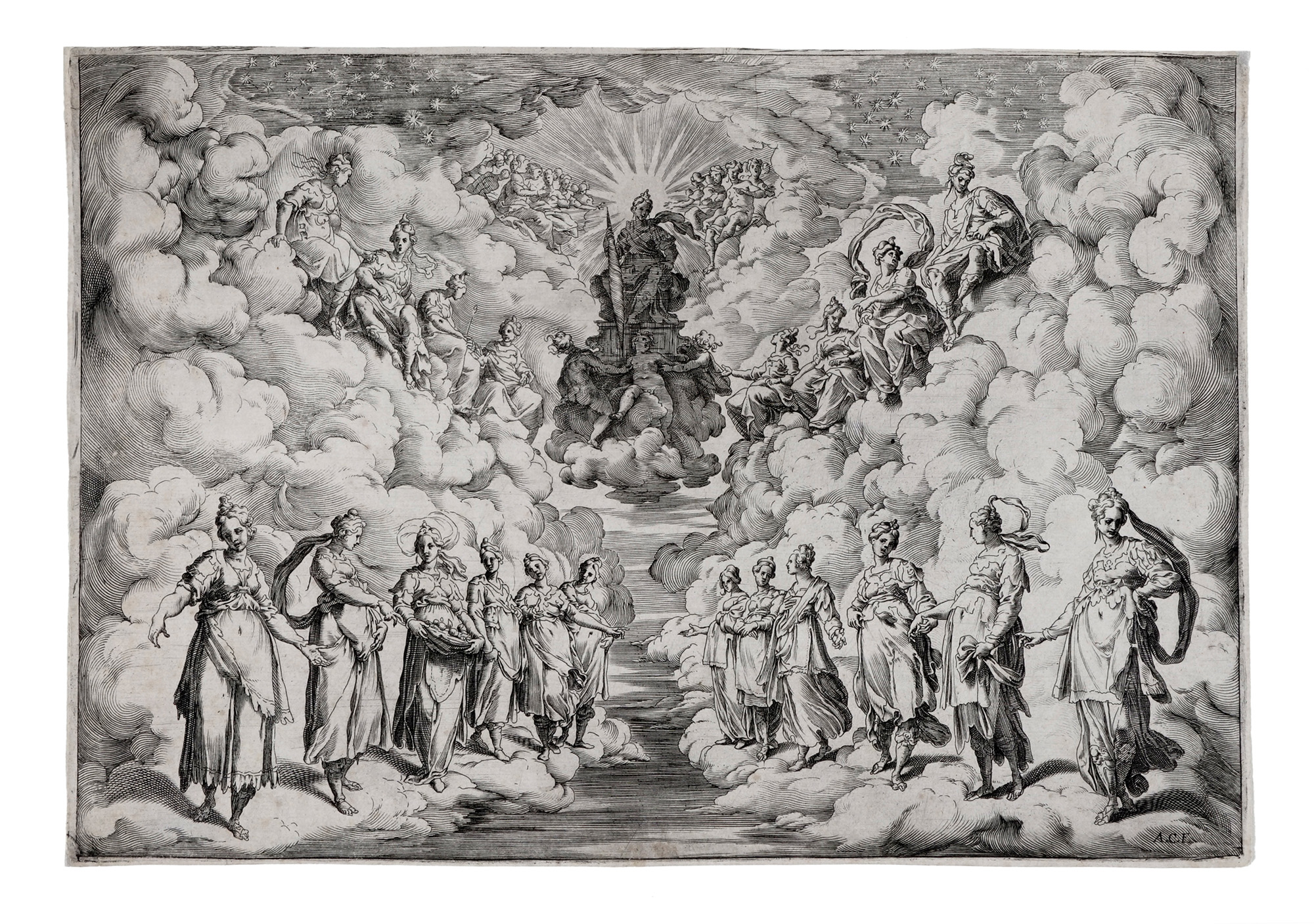 Agostino Carracci, L'armonia delle sfere. 1589-1592/1595. Acquaforte e bulino. mm 240x348. Foglio: mm 244x353. Bartsch,121. DeGrazia, 153. Da invenzione di Bernardo Buontalenti. La stampa, assieme all'Apollo e il Drago, costituisce la scenografia del primo dei sei intermezzi dell'opera di Girolamo Bargagli "La Pelllegrina", rappresentata il 2 maggio del 1589 a Firenze, durante i festeggiamenti per le nozze di Ferdinando I de' Medici e Cristina di Lorena. Ottima prova nel III stato di 3 dopo l'abrasione dell'indirizzo di Filippo Suchielli in basso al centro su bella carta vergellata sottile con filigrana "pellegrino con pastorale in verticale entro ovale" simile a Woodward 23 (Siena, 1590 ca.). Al verso nota a penna e inchiostro bruno "P. Mariette 1668" (Lugt, 1790). (1)