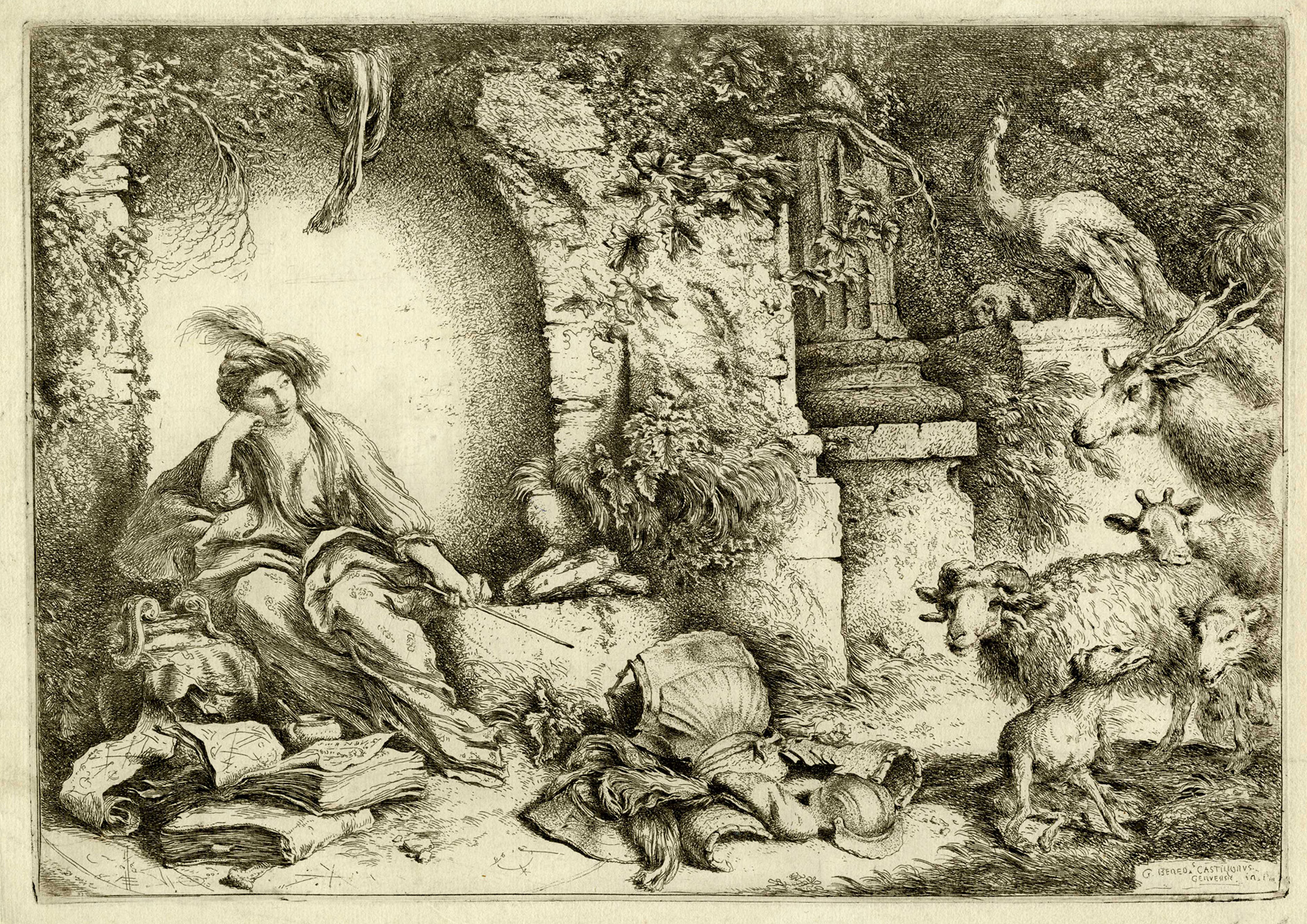 Giovanni Benedetto Castiglione (detto il Grechetto), Circe e i compagni di Ulisse trasformati in bestie. 1650-1651. Acquaforte. mm 219x310. Foglio: mm 237x325. Bartsch, XXI, 22. Bellini (Castiglione), 60. Con la firma "G. Bened.s Castilionus Genuensis in. Pin" sulla lastra in basso a destra. Ottima prova nel I stato di 2, avanti la comparsa del graffio nel ciuffo d'erba sotto la visiera dell'elmo in basso. Carta vergellata priva di filigrana. (1)