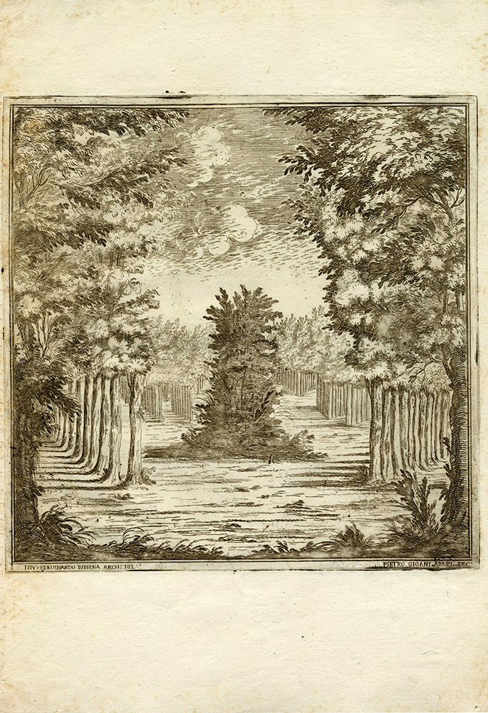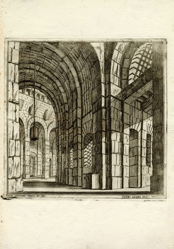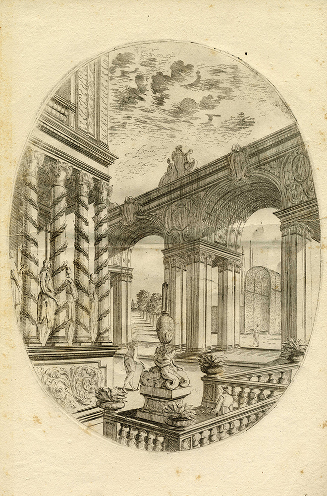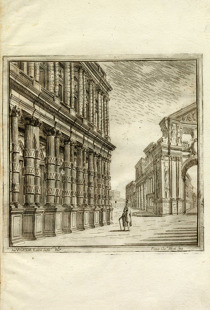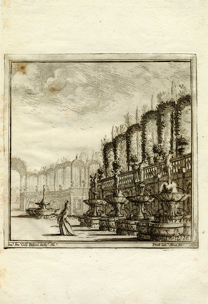 Ferdinando Galli Bibiena Pietro Giovanni Abbati Carlo Antonio Buffagnotti, Sette tavole da Disegni delle Scene, che Seruano alle due opere, che si | rappresentano l’anno corente nel Reggio Teatro di | Torino inuenzioni di Ferdinando Bibiena, Architetto e Pitore | del Ser:mo Sig.rr Duca di Parma ... 1699. Giacomo Camillo Mercati in Bologna, 1717. Acquaforte. mm 250/275x252/268. Foglio: mm 420x290. Al margine inferiore di ciascun esemplare le indicazioni di responsabilità, a sinistra il nome del Bibiena inventore e disegnatore e a destra il nome dell'Abbati che eseguì. Sette tavole, da una serie di 11 più frontespizio, che documentano le scenografie ideate dal Bibiena ed eseguite da Abbati per i due spettacoli carnevaleschi, Endimione ed Esione, rappresentati a Torino nel 1699. La serie venne inclusa nel 1717 nella seconda edizione di Varie opere di Prospettiua inventate da Ferdinando Galli d:o il Bibiena Bolognese...Giacomo Camillo Mercati in Bologna [1701]. 1) Facciata della reggia di Diana con fonti e platani (Endimione Atto I/scena prima). 2) Giardino su le rive del mare (Esione Atto II/scena terza). 3) Piazza con triplicate strade (Esione Atto I / scena prima). 4) Archi che corrispondono alle prigioni (Esione Atto III, scena terza). 5) Capanna di Silvano con Amore in una gabbia (Endimione Atto III/scena prima). 6) Città di Troia assediata, e assalita (Esione Atto II / scena quindicesima). 7) Piccol boschetto con fonti (Endimione Atto II/ scena seconda e Atto III/scena seconda). Bellissime impressioni stampate su carta vergellata sottile con filigrana "stella a otto punte" (Bologna, prima metà XVIII secolo), visibile su parte dei fogli. SI AGGIUNGE: Carlo Antonio Buffagnotti (Bologna 1660-Torino 1710). Capriccio architettonico con gruppo di sirene su basamento. Acquaforte su lastra ovale. mm 340x260. Foglio: mm 420x290. (8)