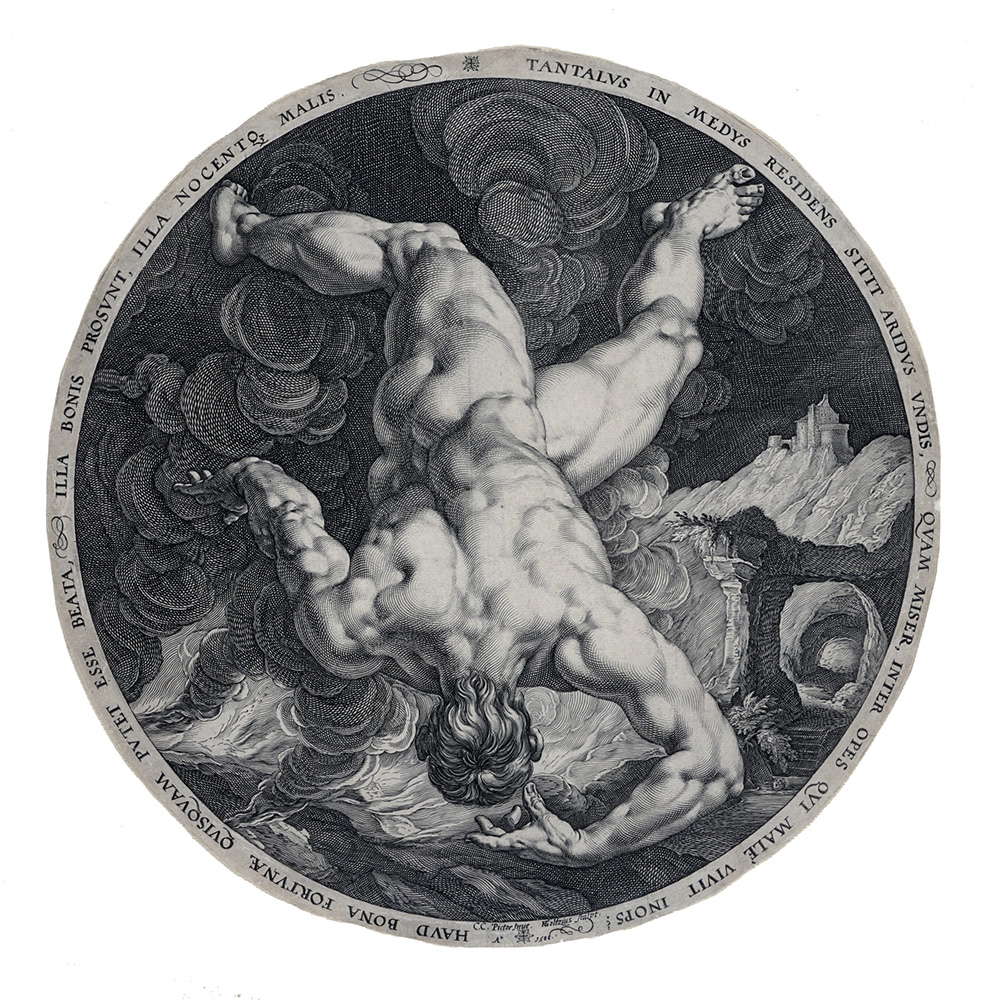 Hendrik Goltzius, Tantalo. 1588. Bulino su lastra rotonda. Ø mm 330. Bartsch, 258. New Hollstein, 325. Con la firma e la data "C.C. Pictor Inue. HGoltzius sculpt / Ao 1588" in basso al centro sotto la testa del personaggio. Da I quattro sventurati serie tratta da soggetti di Cornelis Cornelisz van Haarlem (1563–1638) e incisa nel 1588. Ottima impressione nel I stato di 3 nitidamente stampata su carta vergellata sottile con filigrana "giglio di Strasburgo". (1)