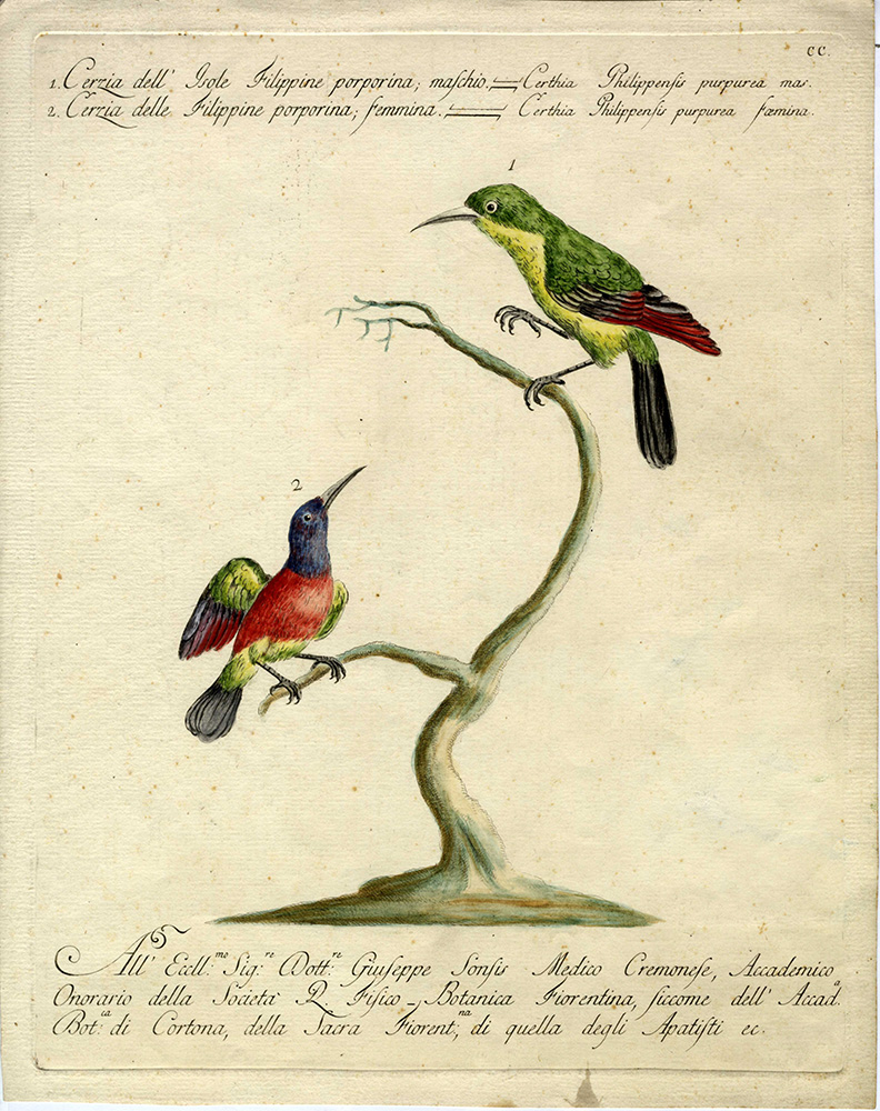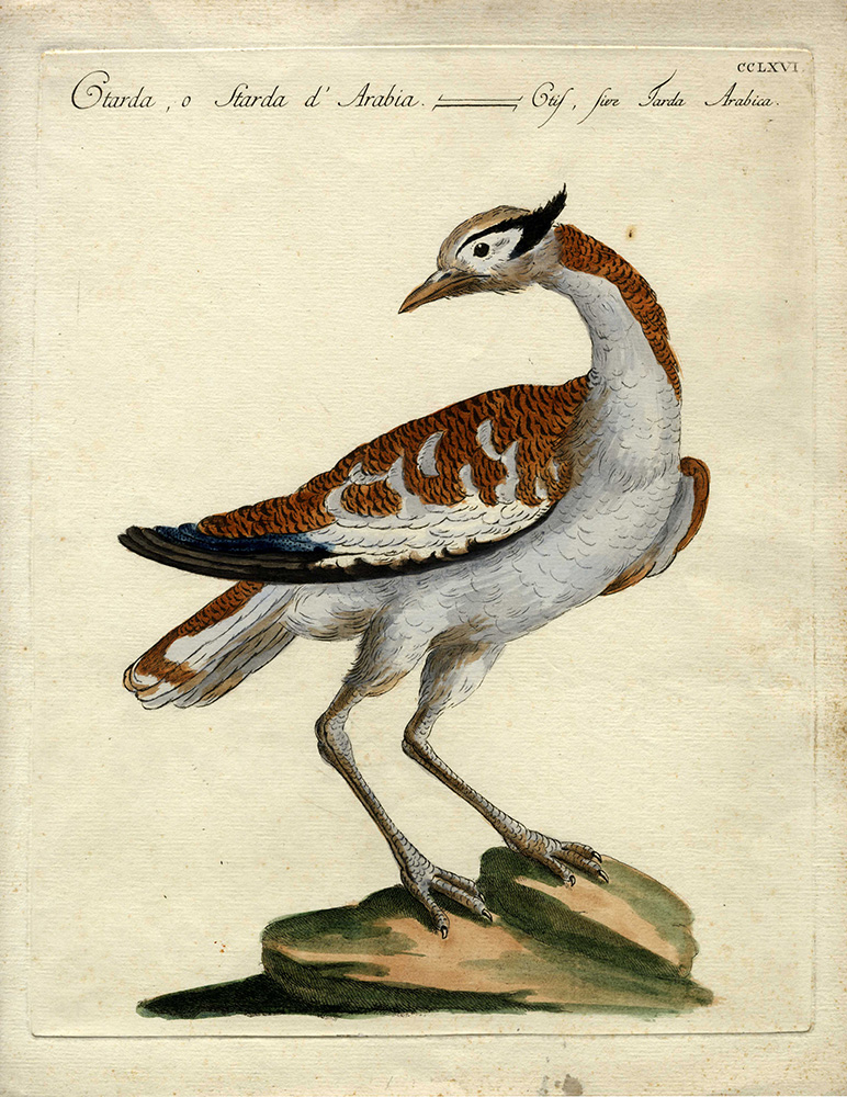 Saverio Manetti, Tre tavole ornitologiche. 1767-1776. Acquaforte in coloritura. mm 345x272. Foglio: mm 370/384x294/308. Da Ornithologia methodice digesta atque iconibus aeneis ad vivum illuminata ornata (latine et italice a Xav. Manetti Laurentio Lorenzi et Violante Vanni). Florentiae, 1767-1776. In alto didascalia descrittiva delle immagini e numero progressivo. Tavola CC, Cerzia dell'Isole Filippine porporina / in basso dedica a Giuseppe Sonsis medico cremonese, Tav. CCLXVI, Otarda o Starda d'Arabia, Tav. CDLV, Sagginella maggiore. Bellissime impressioni in coloritura fresca su carta vergellata pesante con filigrana "stemma con lettere FG/GL" visibile su due fogli. (3)