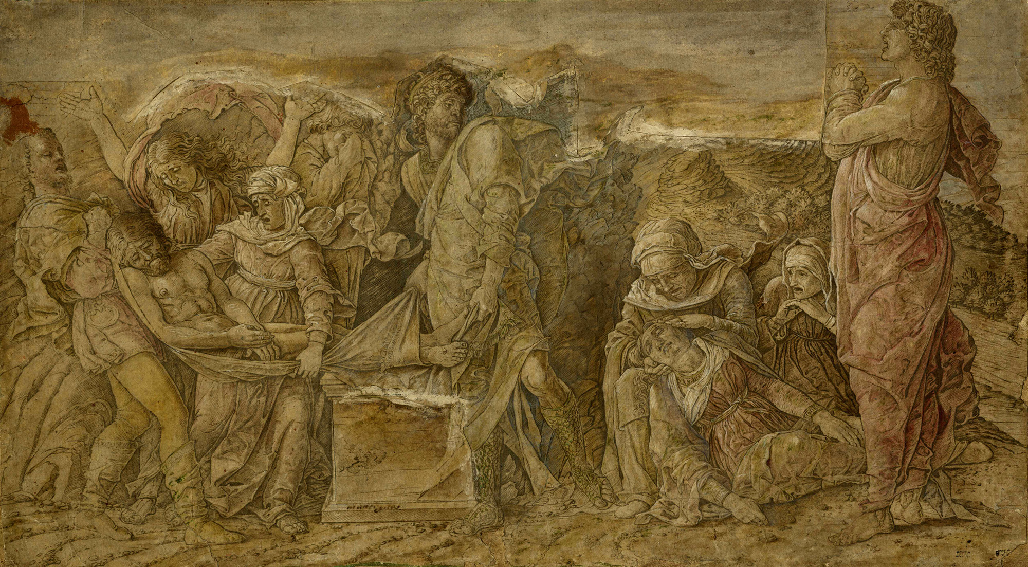 Andrea Mantegna, La deposizione nel sepolcro. 1475 ca. Bulino e puntasecca. mm 240x430. Bartsch, XIII, 3. Hind, 2. Levinson/Oberhuber/Sheehan, 70. Esemplare verosimilmente tardo e lacunoso applicato a supporto e successivamente ripreso con disegno e colore. In basso a destra marchio del pittore ritrattista londinese Thomas Hudson (1701-1779), (Lugt, 2432). (1)
