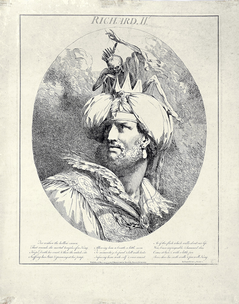 John Hamilton Mortimer, Richard II. 1775. Acquaforte. mm 399x324. Foglio: mm 490x395. Da Twelve Characters of Shakespeare. Mortimer ammirava Salvator Rosa e ne assorbiva aspetti del suo stile drammatico cercando equivalenti britannici per i suoi soggetti poetici. Questa acquaforte proviene da una serie dedicata ai principali personaggi shakespeariani, basata su disegni esposti alla Society of Artists nel 1775. (1)
