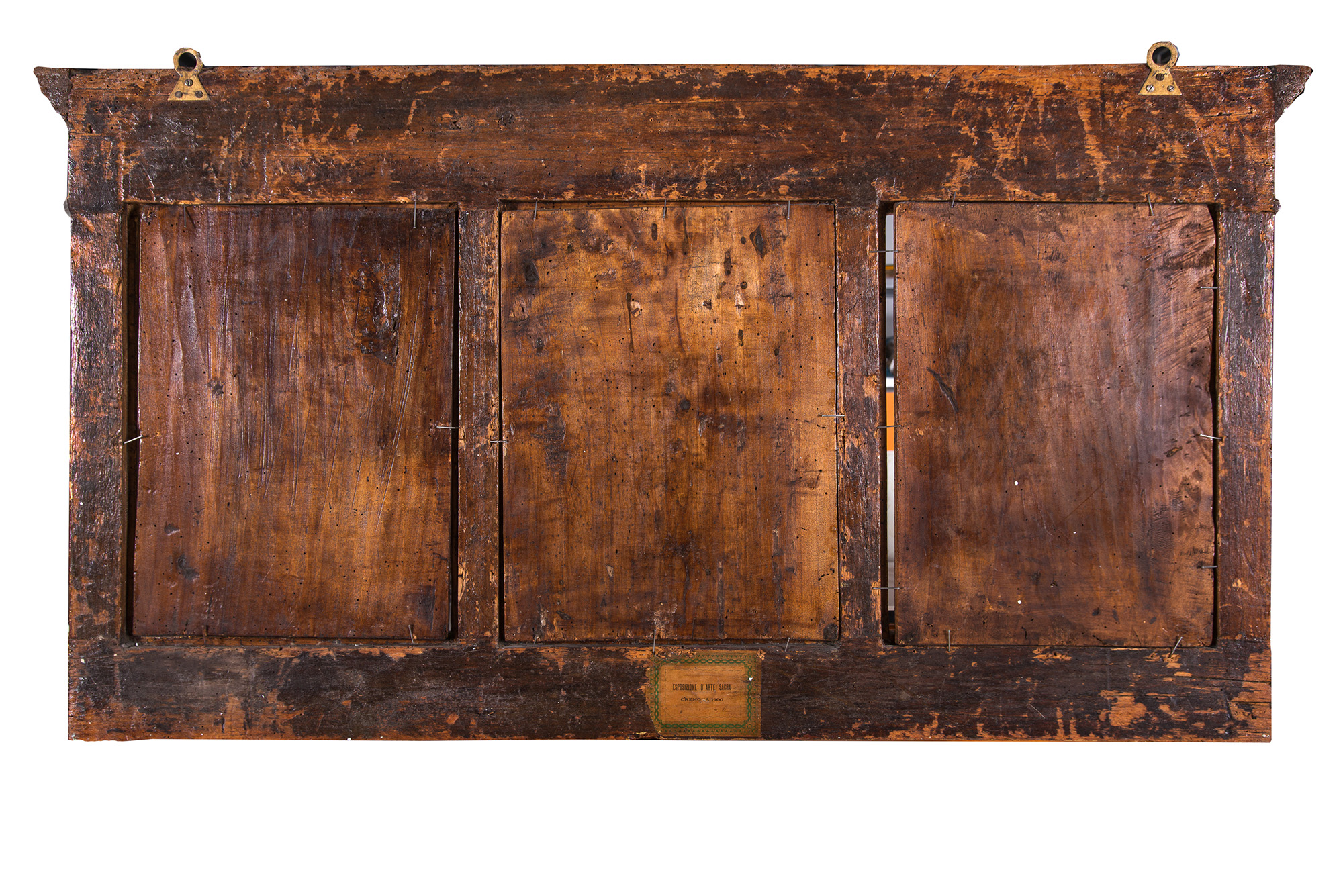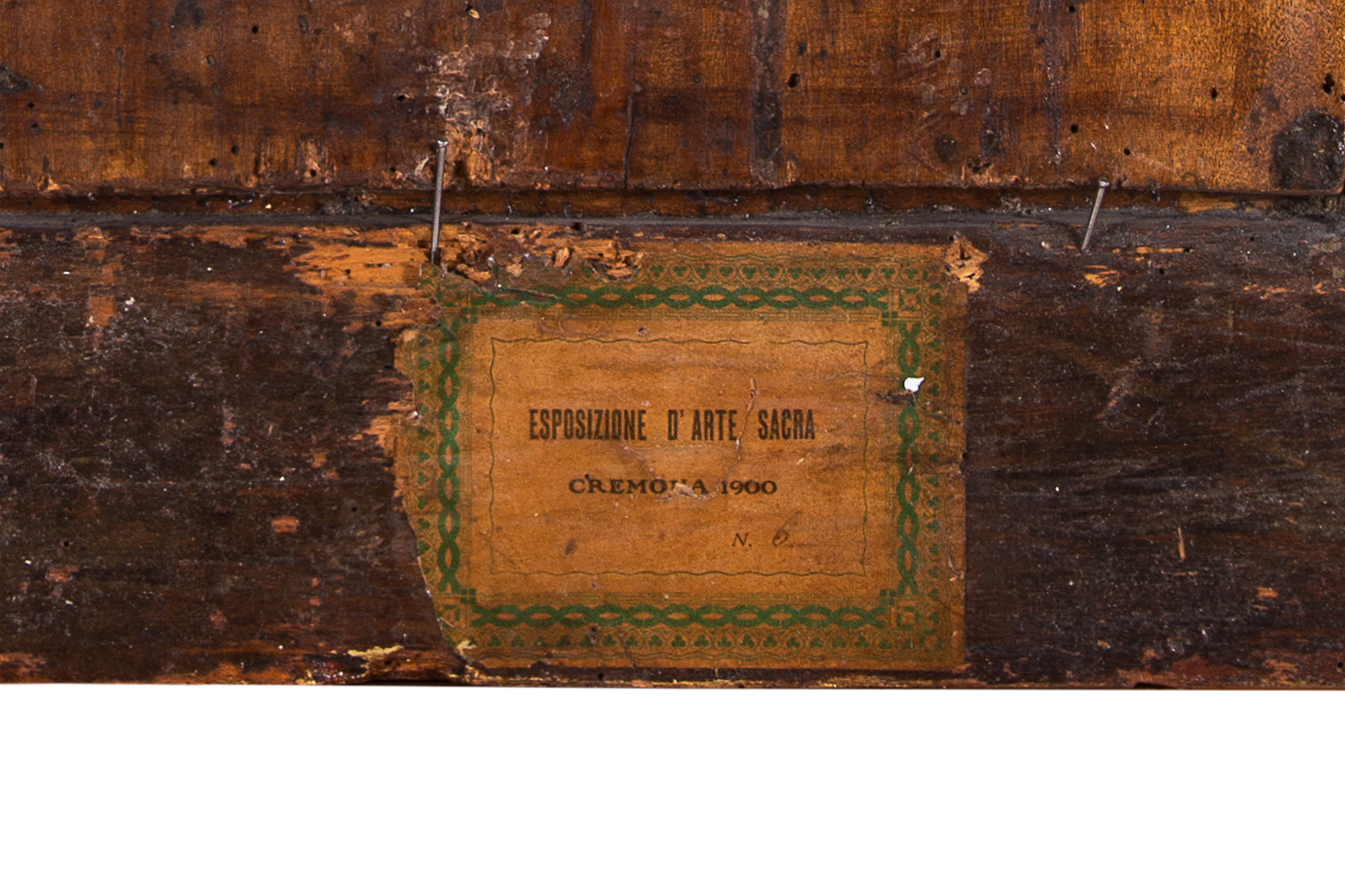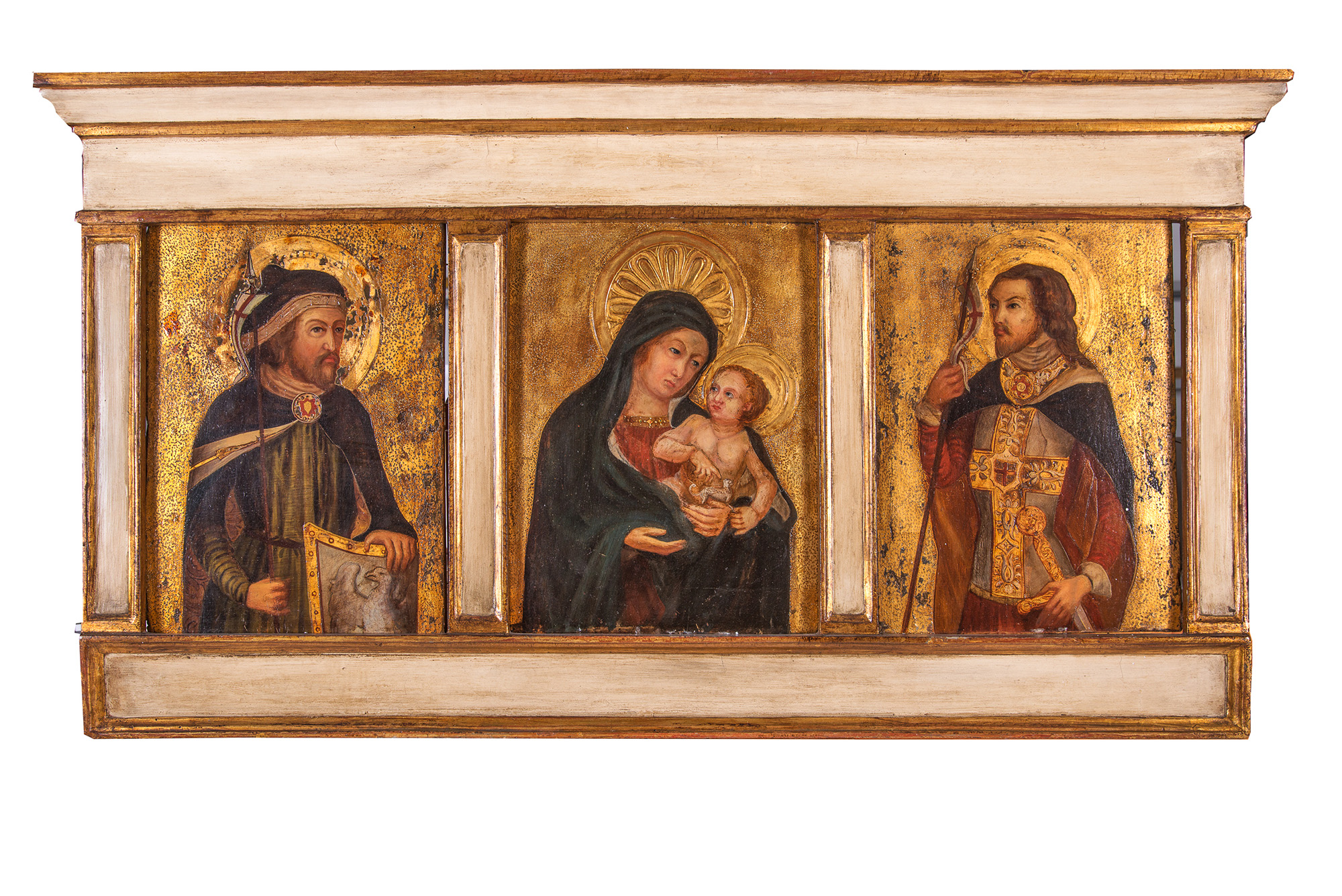 Anonimo del XV secolo, Trittico con Madonna col Bambino e un piccolo gatto, fra San Giorgio e San Maurizio (?). Tempera su tavola. cm 65,5x123. In basso al verso etichetta cartacea "Esposizione d'arte sacra / Cremona 1900". Nel catalogo dell'esposizione il dipinto sembra identificabile con il trittico al numero 6 in sala D, privo di attribuzione e di descrizione dettagliata. Il tema della Madonna col Bambino con la presenza del gatto ricorre nella pittura lombarda a iniziare da alcuni studi di Leonardo databili agli anni 1478-1481 circa (si vedano i disegni al British Museum inv. 1856,0621.1, inv. 1860,0616.98, e inv. 1857,0110.1) per una Madonna del gatto pare mai realizzata. Altri esempi di soggetto affine sono presenti in autori di scuola lombarda: a Vigevano, nella chiesa della Madonna della Neve, si conserva un affresco con la Madonna fra san Sebastiano e san Rocco in cui si vede il Bambino in braccio alla Madonna mentre sta giocando con un gattino; in una Madonna col Bambino attribuita a Giovanni Martino Spanzotti, conservata al Philadelphia Museum of Art (inv. 242), databile al 1475 un gatto è raffigurato mentre mira il cardellino che Gesù Bambino tiene con una cordicella sottile; nella Madonna col Bambino e un gatto attribuita al Maestro della Pala Sforzesca (The Walters Art Museum, Baltimora, inv. 37.455) o alla sua cerchia, invece il gatto viene tenuto al guinzaglio dal Bambino. La presenza del gatto sarebbe da riferire a una scrittura apocrifa secondo cui una gatta partorì nella mangiatoia in cui venne deposto Gesù contribuendo poi a scaldare i suoi piedini adagiandosi su di lui. Infine una tavola, alla Pinacoteca di Brera variamente assegnata alla cerchia di Leonardo, raffigura una Madonna col Bambino e l'agnellino (inv. 1162), dove all'esame radiografico è emerso che in precedenza al posto dell'agnello era raffigurato un gatto, l'animale è di fatto in una posa tipica da felino con la grossa coda in evidenza. (1)