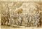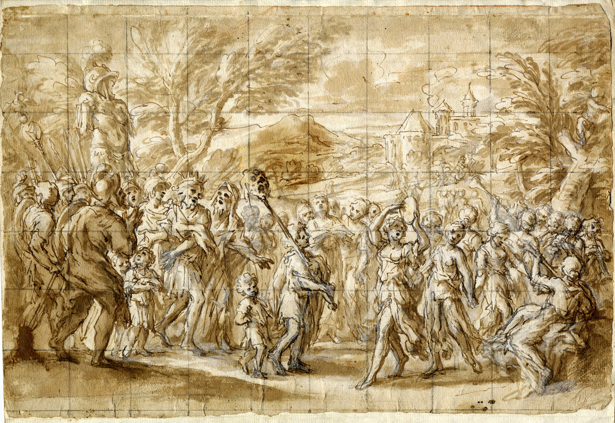 Anonimo del XVII secolo, Il trionfo di David. Penna e inchiostro bruno, pennello e acquerello marrone, su tracce di matita nera, rari rialzi in bianco, carta vergellata color crema. Riquadrato a matita nera. mm 290x428. (1)