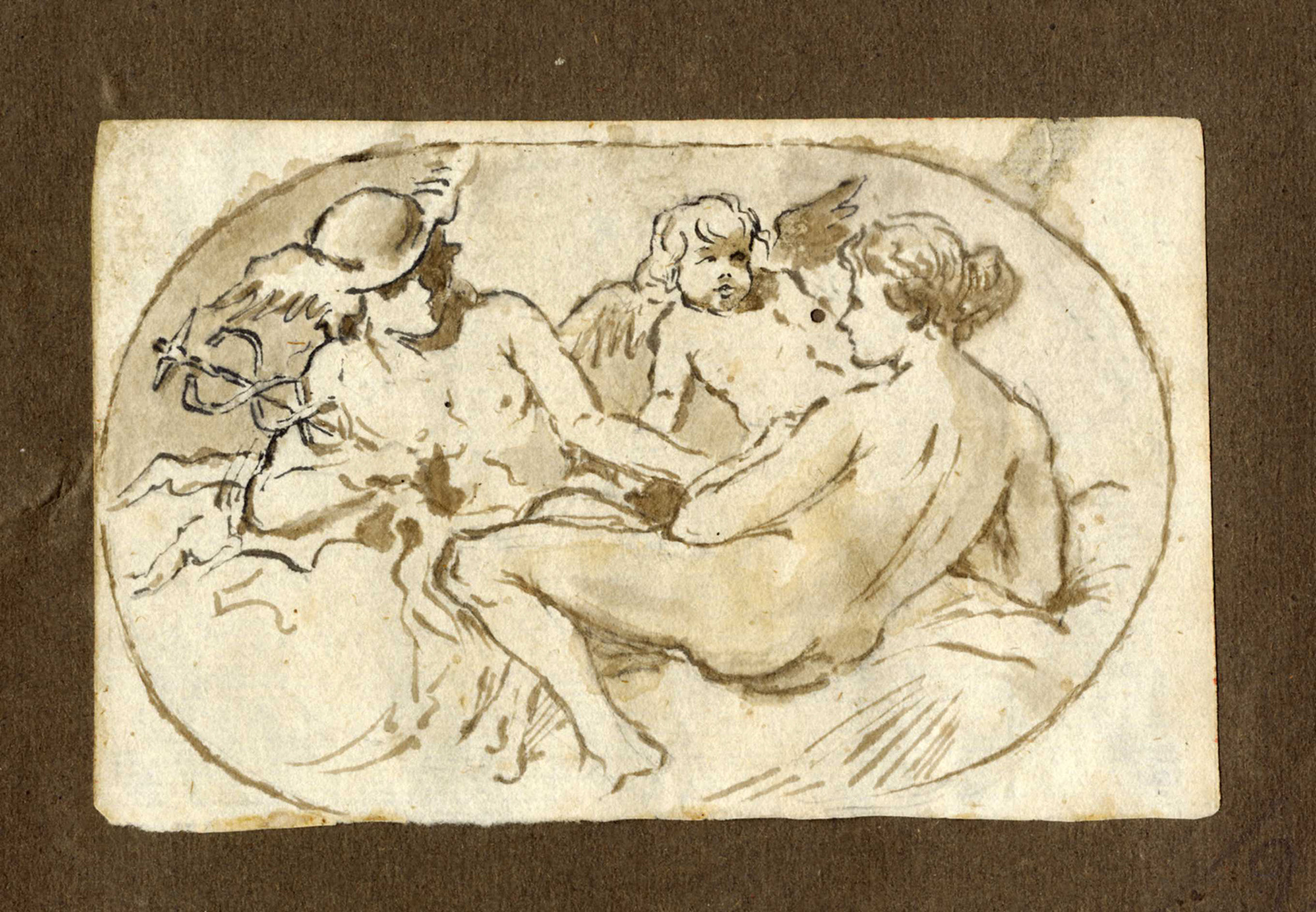 Anonimo del XVII secolo, Mercurio Venere e Cupido. Penna e inchiostro bruno, pennello e acquerello marrone chiaro carta vergellata avorio. mm 75x118. (1)