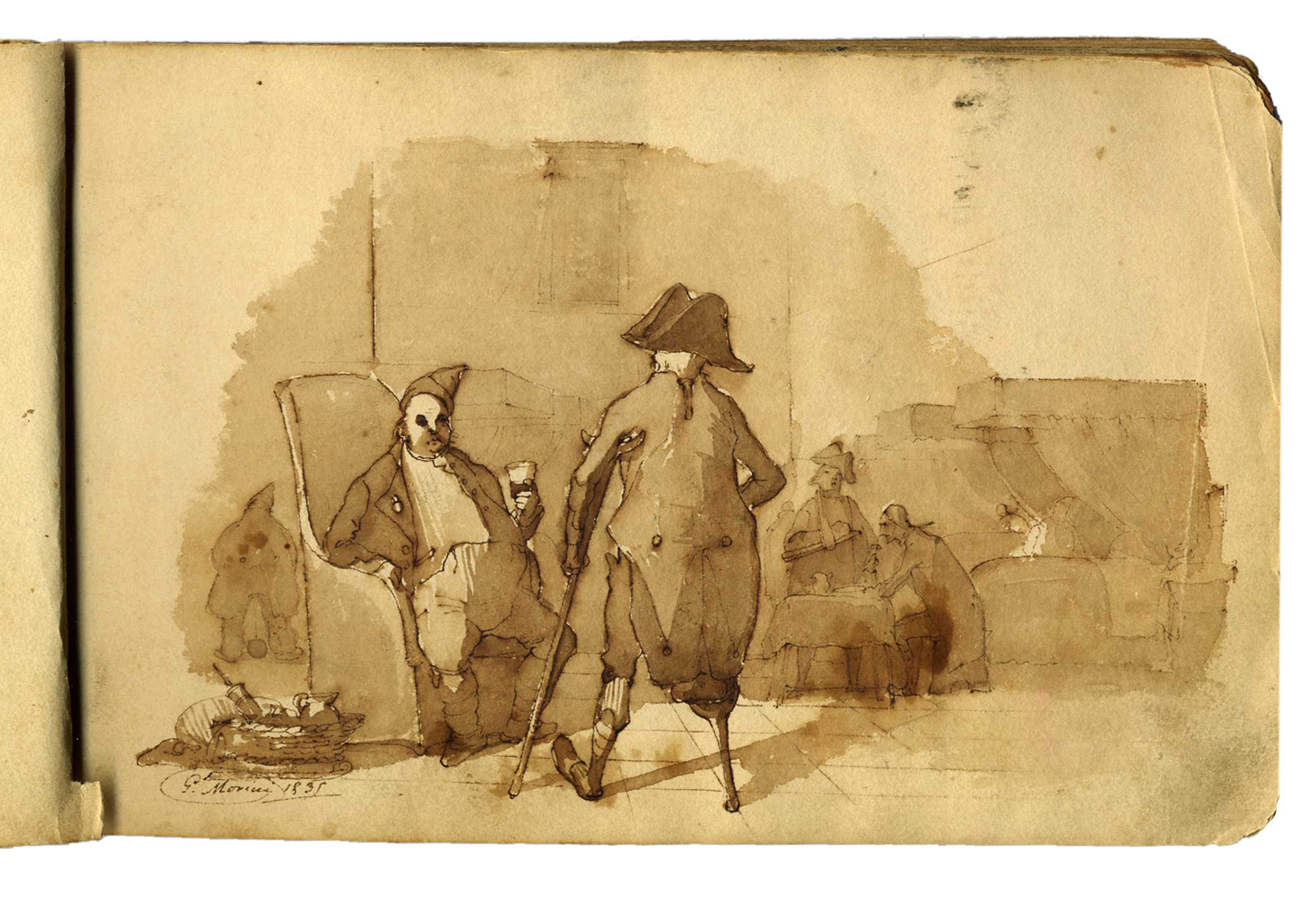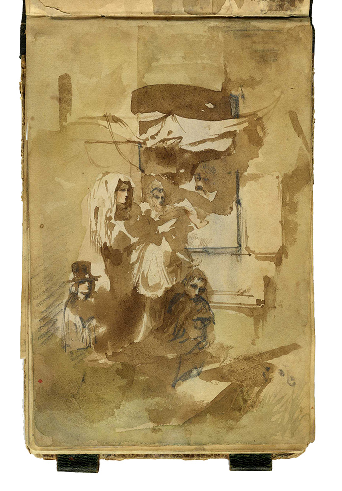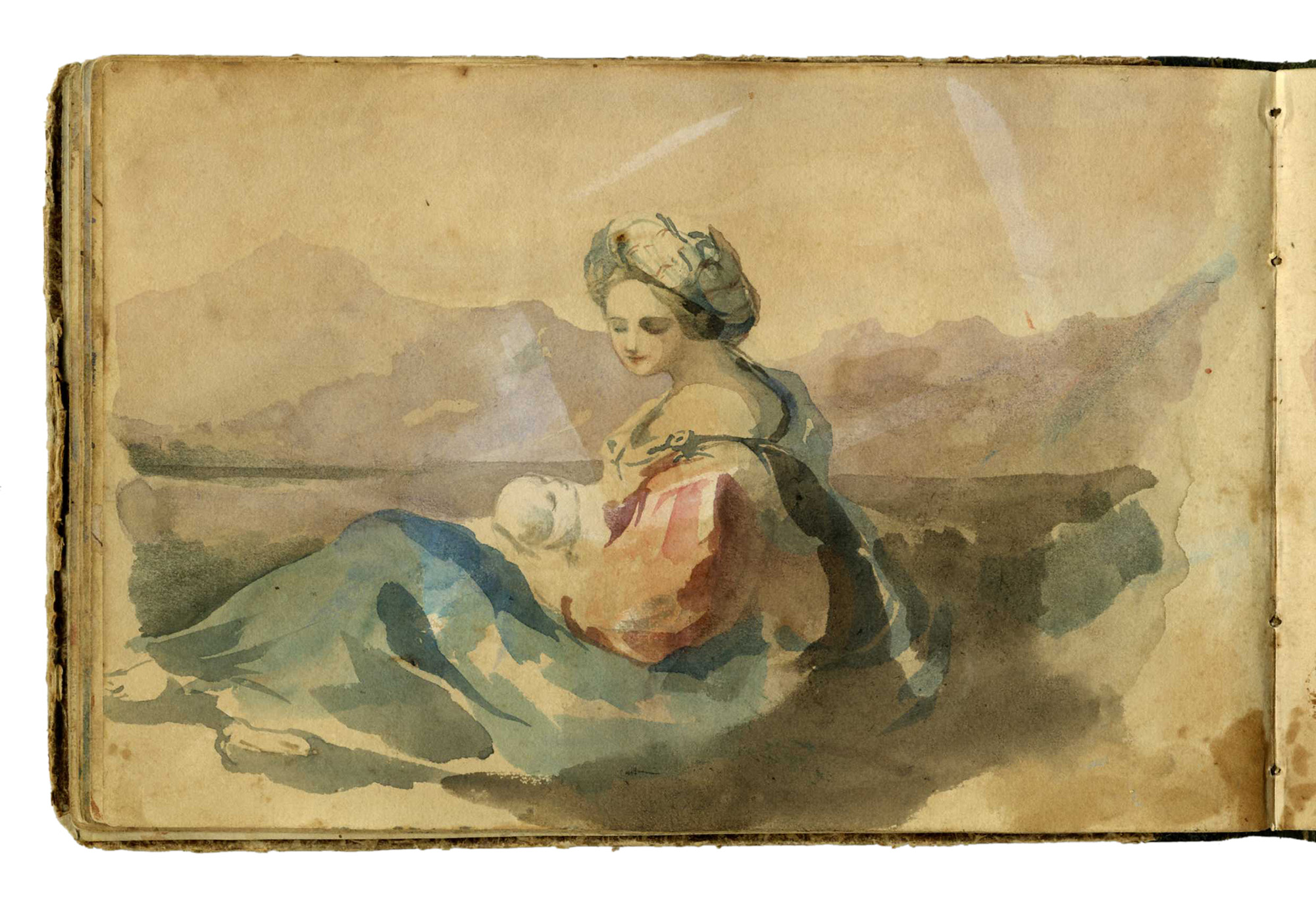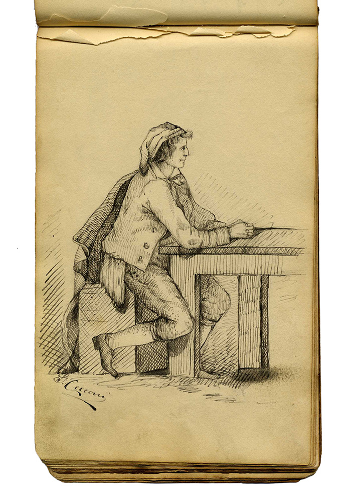 Autori anonimi metà sec. XIX, Due taccuini con pensieri e appunti di viaggio. 1830-1870. In 24° album (mm 120x200 e 125x190). Lotto di due piccoli album: un liber amicorum contenente dediche, pensieri brevi, poesie, piccole vedute come appunti di viaggio e numerosi disegni tra i quali da segnalare un piccolo acquerello di Giuseppe Moricci (Firenze, 1806-1879) firmato e datato 1835, altro con la firma di Gaetano Palazzi (Bologna, 1830-1892). L'altro album si presenta come taccuino di un viaggiatore inglese che appunta ad acquerello i paesaggi e i personaggi incontrati durante il suo viaggio in Italia. Legature con dorso in pelle e piatti in carta decorata. (2)