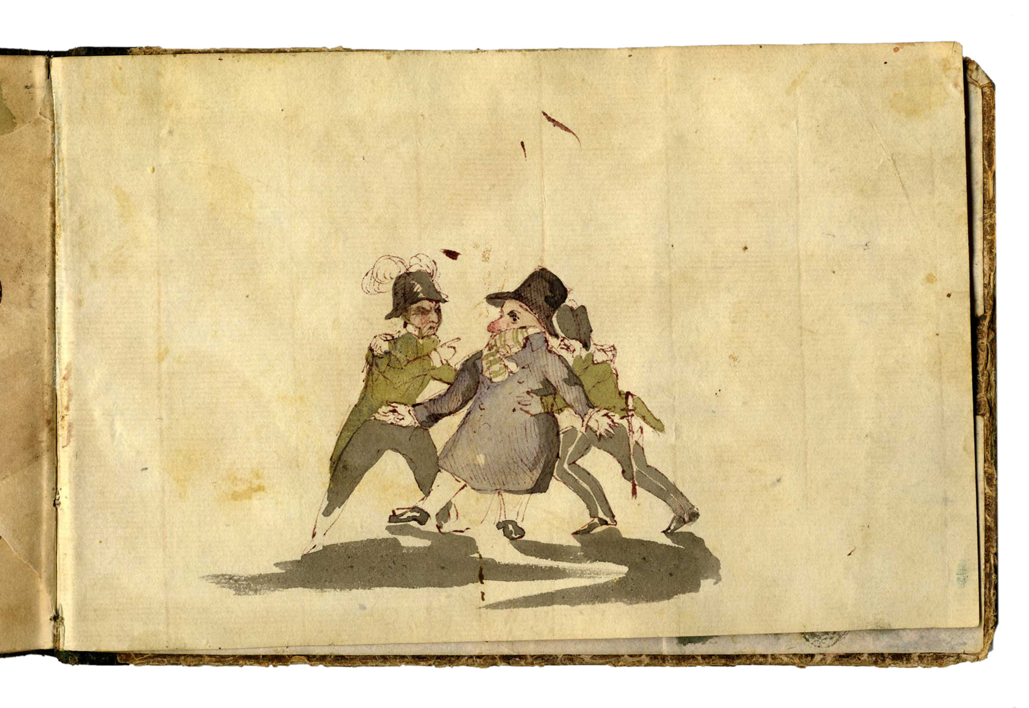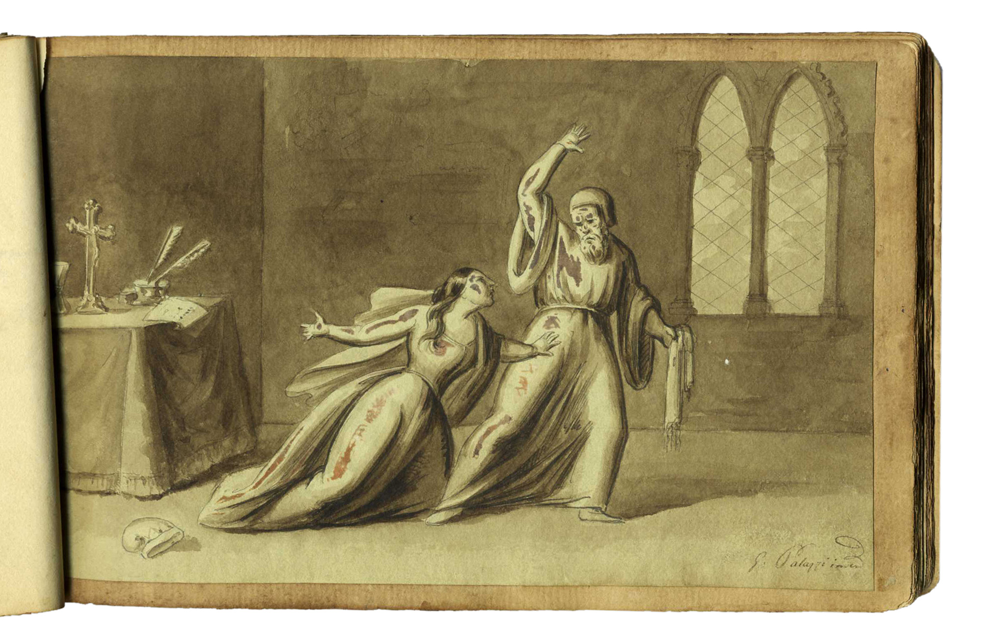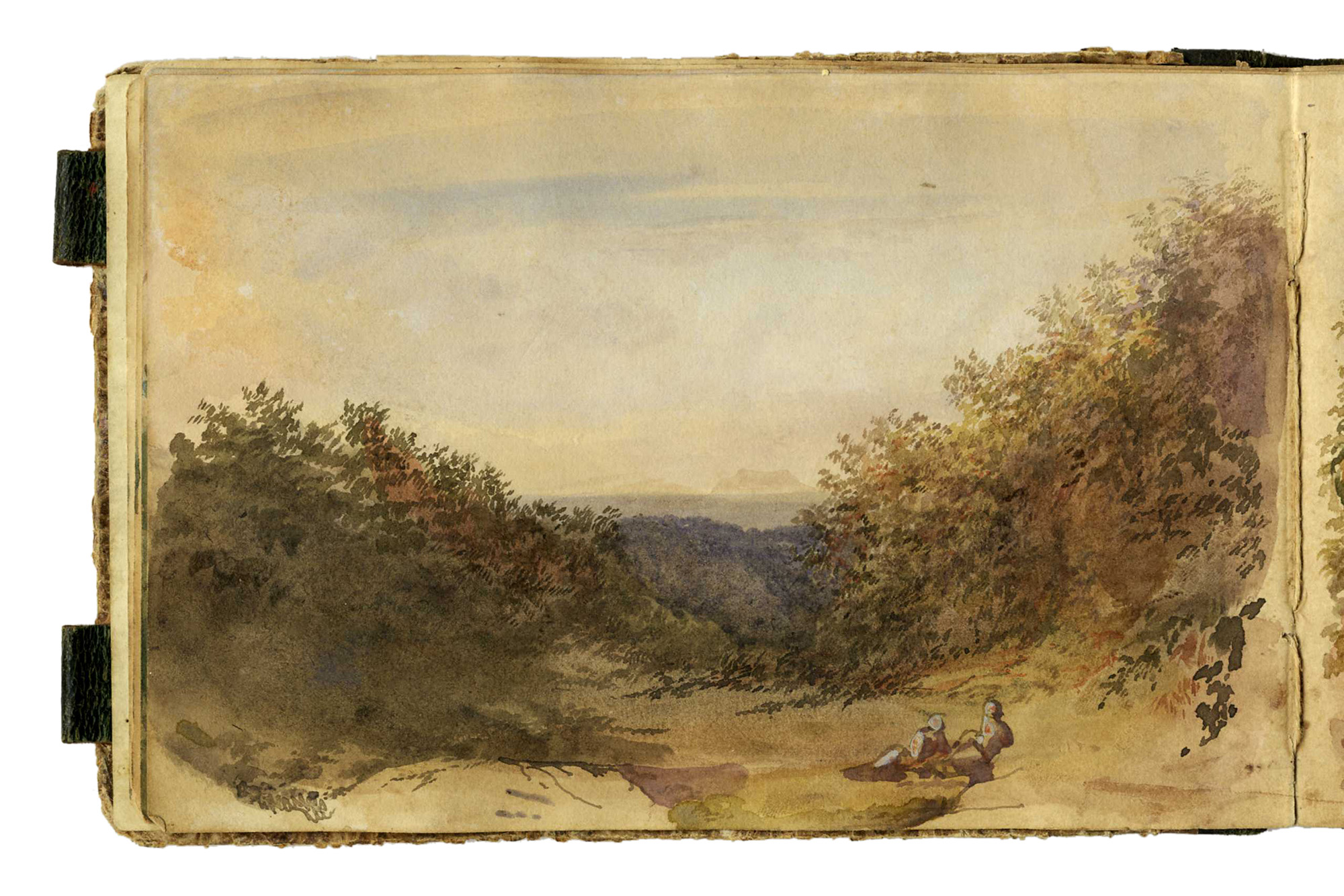 Autori anonimi metà sec. XIX, Due taccuini con pensieri e appunti di viaggio. 1830-1870. In 24° album (mm 120x200 e 125x190). Lotto di due piccoli album: un liber amicorum contenente dediche, pensieri brevi, poesie, piccole vedute come appunti di viaggio e numerosi disegni tra i quali da segnalare un piccolo acquerello di Giuseppe Moricci (Firenze, 1806-1879) firmato e datato 1835, altro con la firma di Gaetano Palazzi (Bologna, 1830-1892). L'altro album si presenta come taccuino di un viaggiatore inglese che appunta ad acquerello i paesaggi e i personaggi incontrati durante il suo viaggio in Italia. Legature con dorso in pelle e piatti in carta decorata. (2)