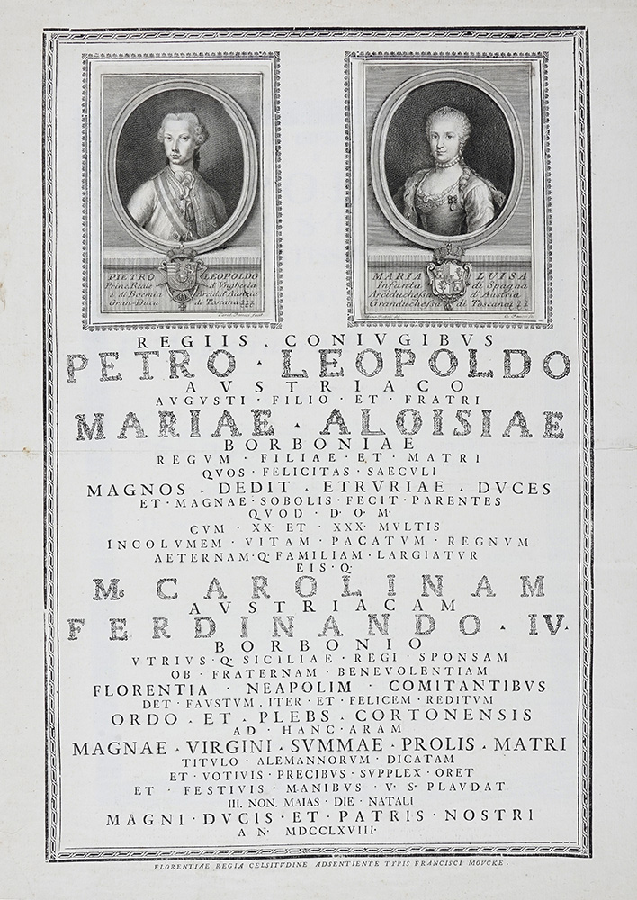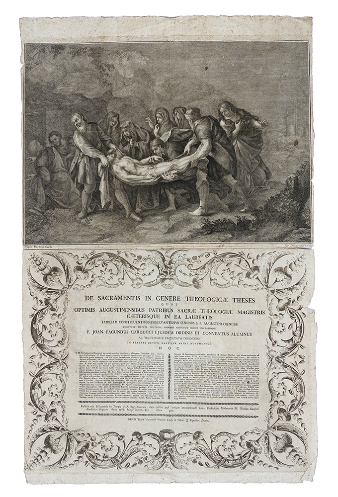 Anonimo del XIX secolo, Anacreontica dedicata dai pastori accademici Rozzi a Maria Luisa Giuseppa Infanta di Spagna Regina reggente d'Etruria in occasione della sua visita. Siena: Stamperia della Comunità ed Arcivescovile per Francesco Rossi e Figlio, 1804. Incisione. mm 735x462. Con tavola incisa da Agostino Costa (Firenze, 1754 - Siena, 1820) raffigurante Apollo che pone la mano sull'insegna con il motto dell'Accademia "Chi qui soggiorna acquista quel che perde" e Minerva. SI AGGIUNGONO: Anonimo. Sonetto dedicato dal Magistrato e dal Popolo sanese a Leopoldo II d'Austria in occasione della sua visita a Siena (Ottobre 1767). mm 570x420 / Tesi dell'Abate Giovanni Facondo Carducci, con tavola incisa da Lorenzo Lorenzi (attivo 1750-1788), raffigurante La deposizione nel sepolcro. 1786. Senis: Typis Vincentii Pazzini Carli & Filior. mm 815x510 / Invocazione per i coniugi reali granduchi di Toscana Pietro Leopoldo e Maria Luisa con i ritratti dei sovrani incisi da Carlo Faucci su disegno di Anna Piattoli. 1768. Florentiae Regiae Celsitudine adsentiente Tipis Francisci Moücke. mm 570x433. (4)