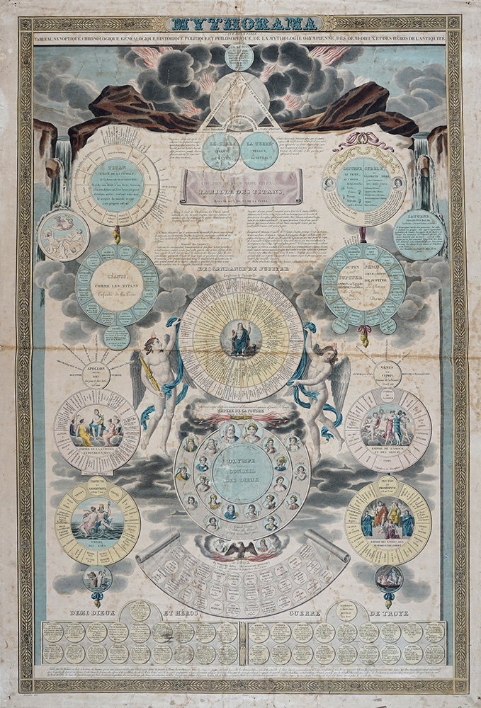 Jean Nicolas Lerouge, Mythorama, tableau synoptique, chronologique, généalogique, historique, politique et philosophique de la mythologie olympienne, des demi-dieux et héros de l'antiquité. 1829. Litografia a colori. mm 885x584. Foglio: mm 940x650. Su disegno di Jean-Bernard Duvivier (Bruges, 1762- Parigi, 1837). (1)