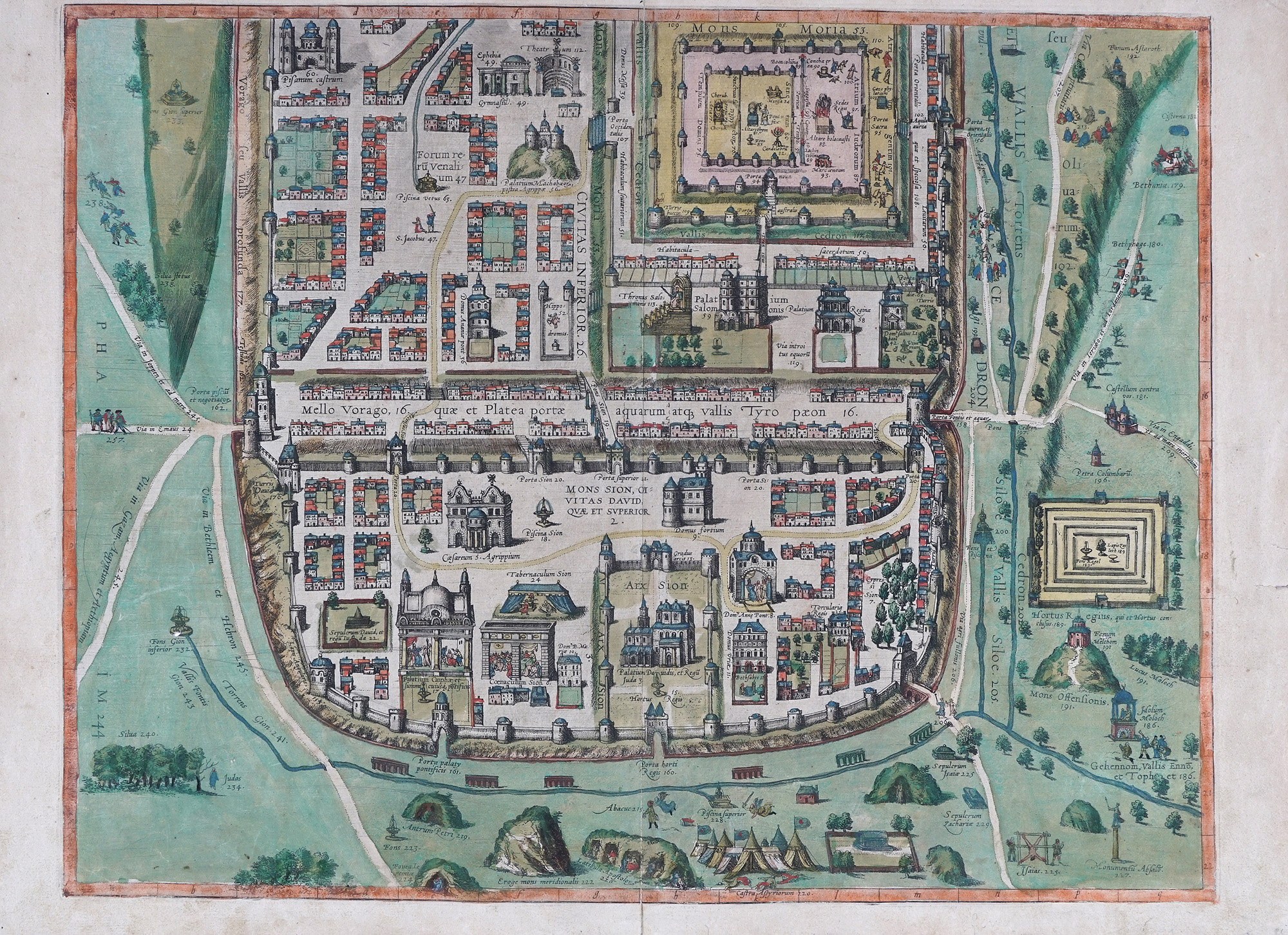 Georg Braun Frans Hogenberg, Ierusalem, et Suburbia eius, sicut Tempore Christi Floruit, cum Locis in quibus Christ Passus ... Descripta per Christianum Adrichom Delphum. Colonia: 1588. Incisione in rame in coloritura. mm 372x480. Foglio: mm 400x550. Dall'edizione con testo latino al verso di Civitates Orbis Terrarum. Parte inferiore della mappa in due fogli basata su quella di Christian van Adrichom pubblicata nel 1584 a Colonia nel suo Theatrum Terrae Sanctae. Questa sezione della carta è dedicata alla "città santa" così chiamata perché vi si trovava il Tempio, il più sacro dei luoghi, che si estendeva dalla vecchia cinta fino alla Valle del Mello, detta anche Strada della Porta delle Acque e Valle dei Casari (Tyropoéon). Il Tempio è rappresentato come un complesso quadrato, aperto, racchiuso da mura concentriche. A sud è il Cenacolo (6), con Gesù e i Discepoli raffigurati nell'Ultima Cena; a sinistra il Palazzo di Caifa (17); a sud del Monte del Tempio, il palazzo (59) e il trono (113) di Salomone. L'illustrazione tenta di collegare gli eventi della Passione e dei luoghi santi menzionati nella Bibbia con la topografia reale di Gerusalemme, si osservano oltre 250 siti e scene raffiguranti luoghi ed episodi descritti nella Bibbia senza un ordine cronologico. La pianta stessa è circondata da molte illustrazioni di interesse biblico e storico. (1)