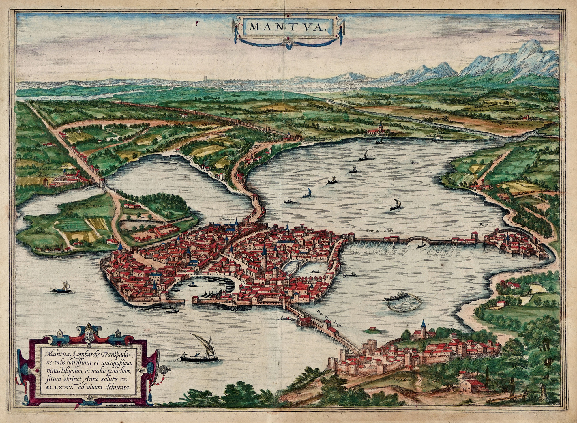 Georg Braun Frans Hogenberg, Mantua, Lombardie, Transpadane Urbs clarissima et antiquissima, venustissimum, in medio paludium,situm obtinet Anno salutis CIƆ.IƆ.LXXV. Köln: Gottfried von Kempen, 1575.