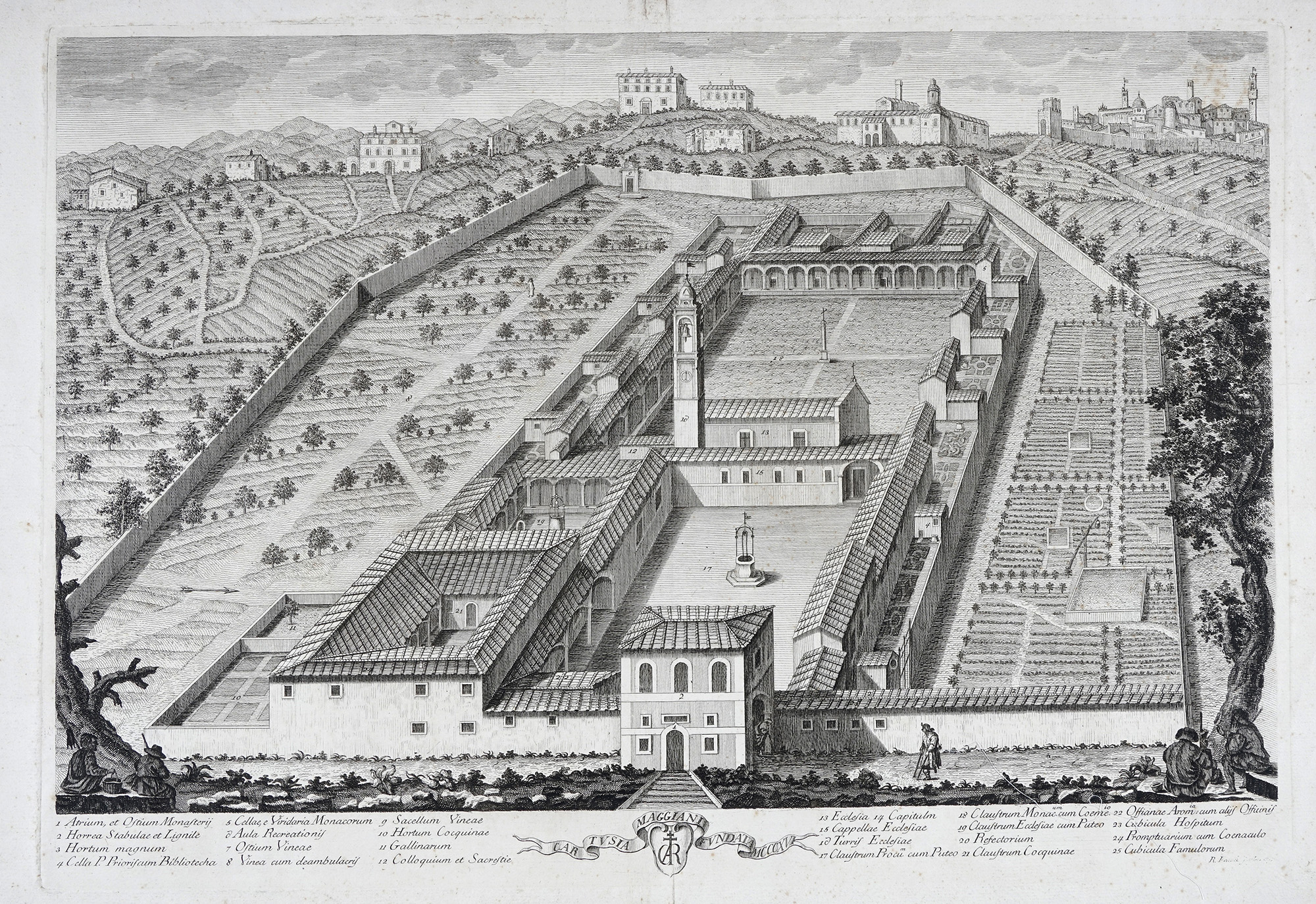 Raimondo Faucci, Cartusia Maggiani fundata MCCCXVI (Certosa di Maggiano). 1770. Acquaforte. mm 433x625. Foglio: mm 485x755. Tavola firmata in basso a destra. Bellissima prova su carta vergellata pesante. La certosa venne fondata nel 1316 per volontà del Cardinal Riccardo Petroni come luogo destinato alla preghiera e alla meditazione; nel corso del XVI secolo durante la guerra tra la Francia di Enrico II e la Spagna di Carlo V venne in parte distrutta. Nel 1782 Leopoldo II Granduca di Toscana decise di alienare le celle per rivenderle a privati. Nel 1969 diviene residenza privata e nel 1978 struttura ricettiva. (1)