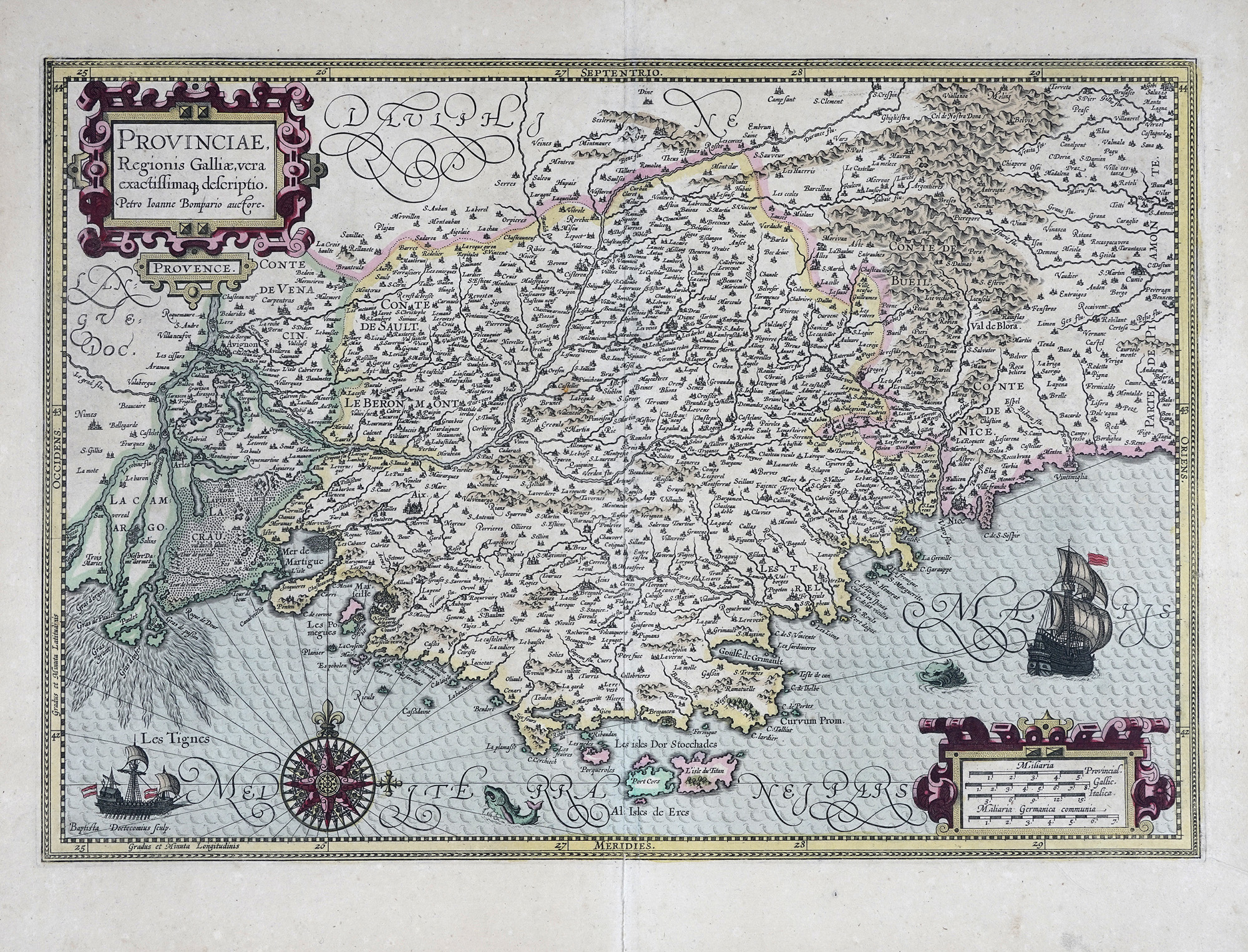 Jodocus Hondius , Provinciae, Regionis Galliae, vera exactissimaq. descriptio. Provence Petro Ioanne Bompario auctore. Amsterdam: 1606 ca. Incisione in rame. mm 357x515. Foglio: mm 455x575. Carta della Provenza, da Avignone al delta del Rodano fino a Saluzzo e Sanremo, tratta da quella di Pierre-Jan de Bompar del 1591. Numerosi elementi decorativi, vascelli, mostri marini, e calligrafia ornata, nello stile dell'autore dell'intaglio Baptista van Doethecum. (1)