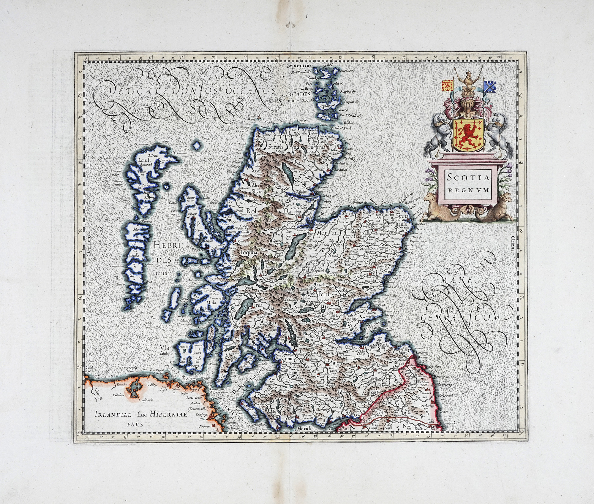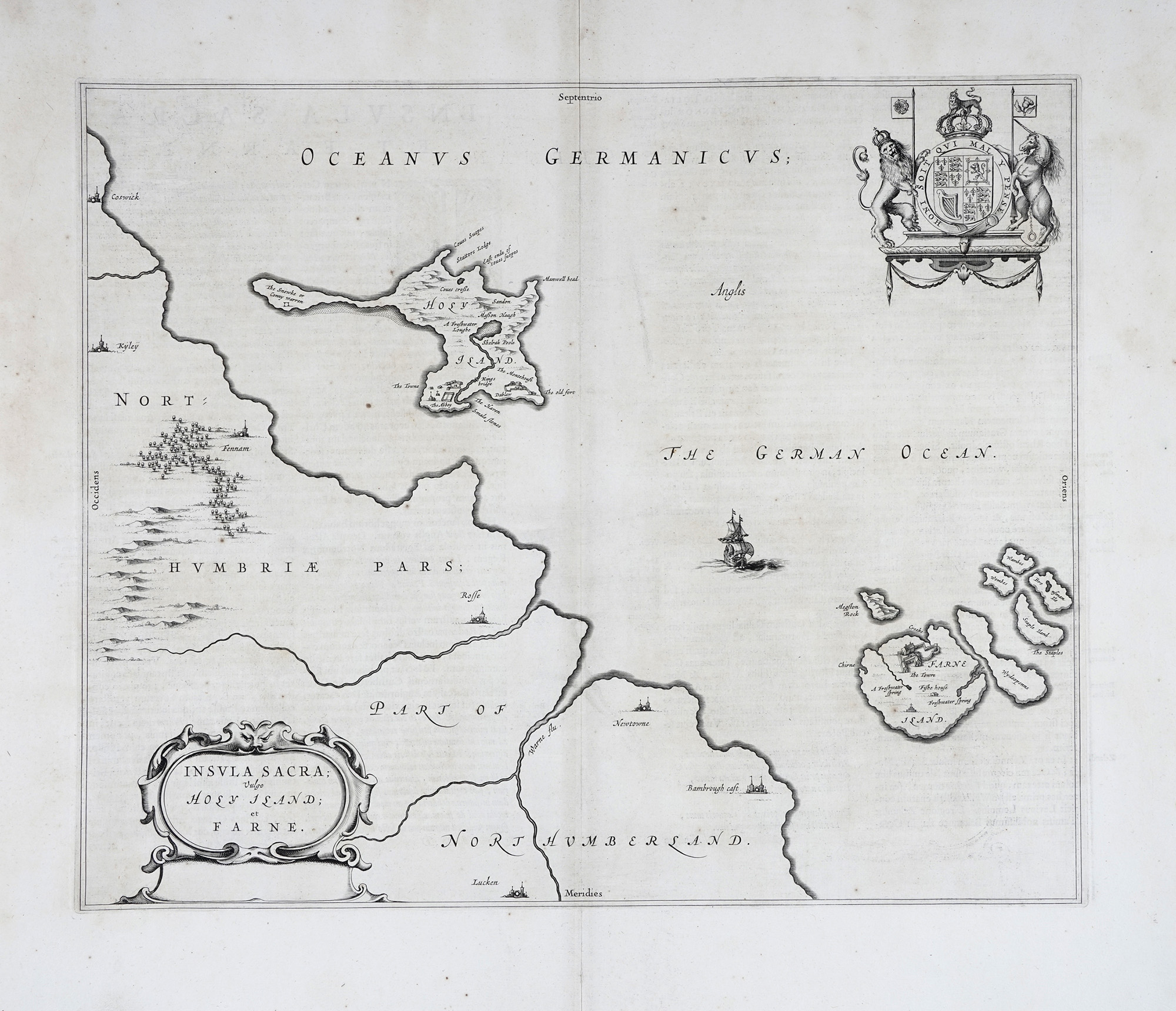 Gerard Mercator , Scotia Regnum. Amsterdam: 1636 ca. Incisione in rame in coloritura. mm 350x407. Foglio: mm 483x575. Testo inglese al verso. SI AGGIUNGE: Johannes Blaeu, Insula Sacra, vulgo Holy Island et Farne, Amsterdam: 1645 ca. Incisione in rame. mm 390x475. Foglio: mm 507x595. Grande mappa decorativa dell'Isola sacra di Lindisfarne e delle Isole Farne, al largo della costa del Northumberland, dall'edizione latina dell'Atlas Novus. Un veliero naviga nel mare tra le isole, in basso a sinistra cartiglio con il titolo e nell'angolo in alto a destra le armi reali. (2)