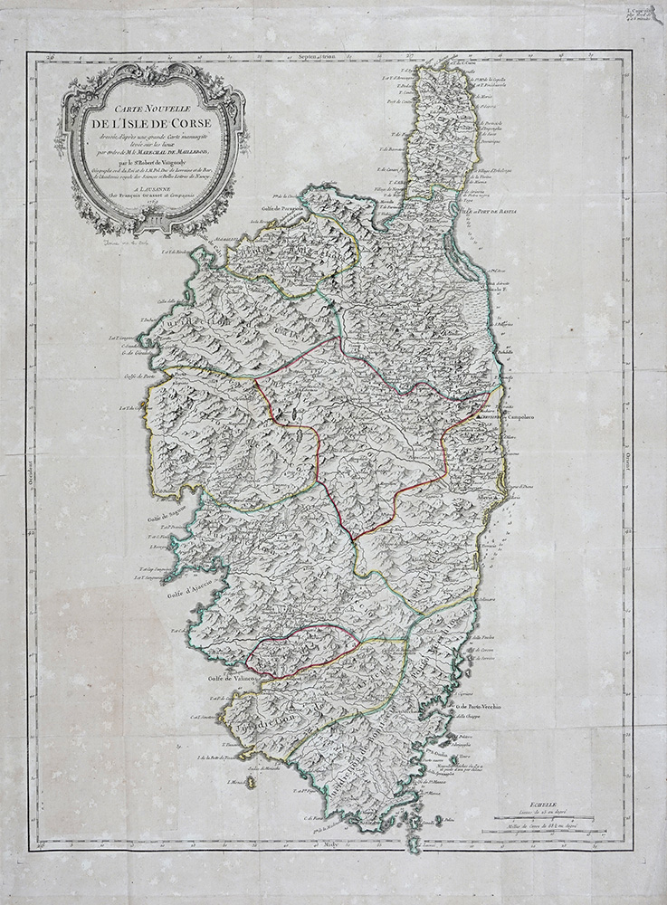 Gilles Robert de Vaugondy , Carte nouvelle de l'Isle de Corse dressée, d'après une grande Carte manuscrite levée sur les lieux par ordre de M. le Marechal de Maillebois, par le Sr Robert de Vaugondy. À Paris chez l'auteur, 1769. Incisione in rame con confini in coloritura. mm 640x487. Foglio: mm 690x500. (1)