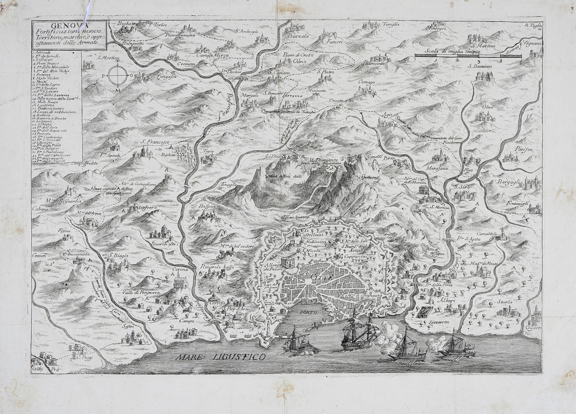 Delineato da Andrea Calino Ingegnero Torrinese e Intagliata da Maria Felice Bianchi Filosi, GENOVA Fortificazioni nuove Territorio, marchie, e appostamenti delle Armate. Fine XVII inizio XVIII secolo. Incisione in rame. mm 330x473. Foglio: mm 402x545. In alto a sinistra tabella con il titolo e legenda a 34 richiami. Mappa di Genova e del suo entroterra con fortificazioni e appostamenti delle armate. (Cfr. Biblioteca Universitaria di Genova, Stampe 5.57, scheda 4/10) (1)