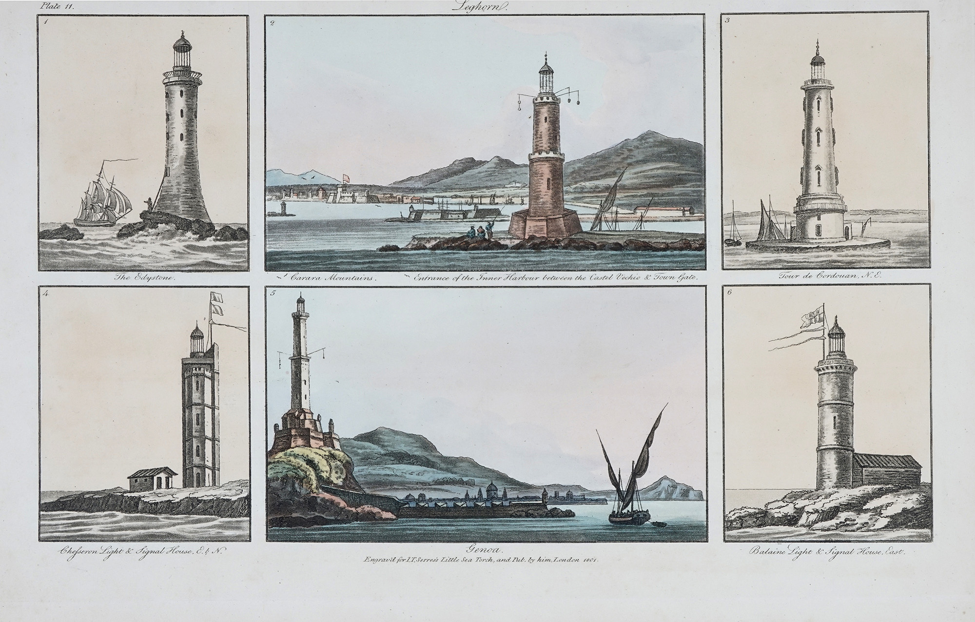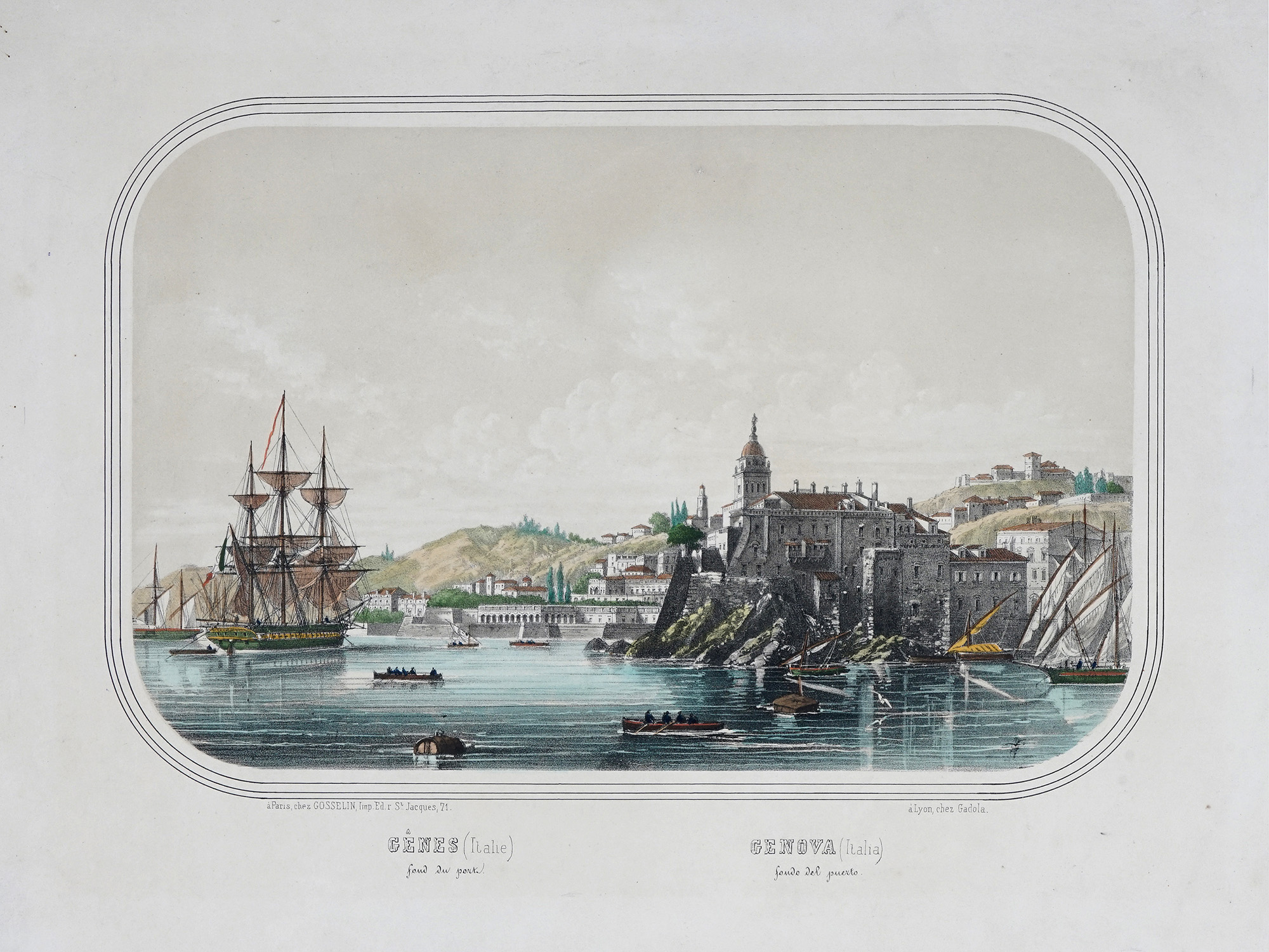 Autori vari, Quattro vedute del Porto di Genova. XIX secolo. Litografia/Acquatinta/Incisione in rame. Dimensioni varie. Si segnalano: Sei vedute di fari tra i quali quello di Genova e quello di Livorno. Da John Thomas Serres, The Little Sea Torch: Or, True Guide for Coasting Pilots: By Which They are Clearly Instructed How to Navigate Along the Coasts of England, Ireland, France, Spain, Portugal, Italy, and Sicily..., London 1801. / Paris Chez Gosselin e Lyon Chez Gadola, Gênes (Italie) fond du port. Incisione in rame e acquatinta a colori. mm 205x308. Foglio: mm 305x408. (5)