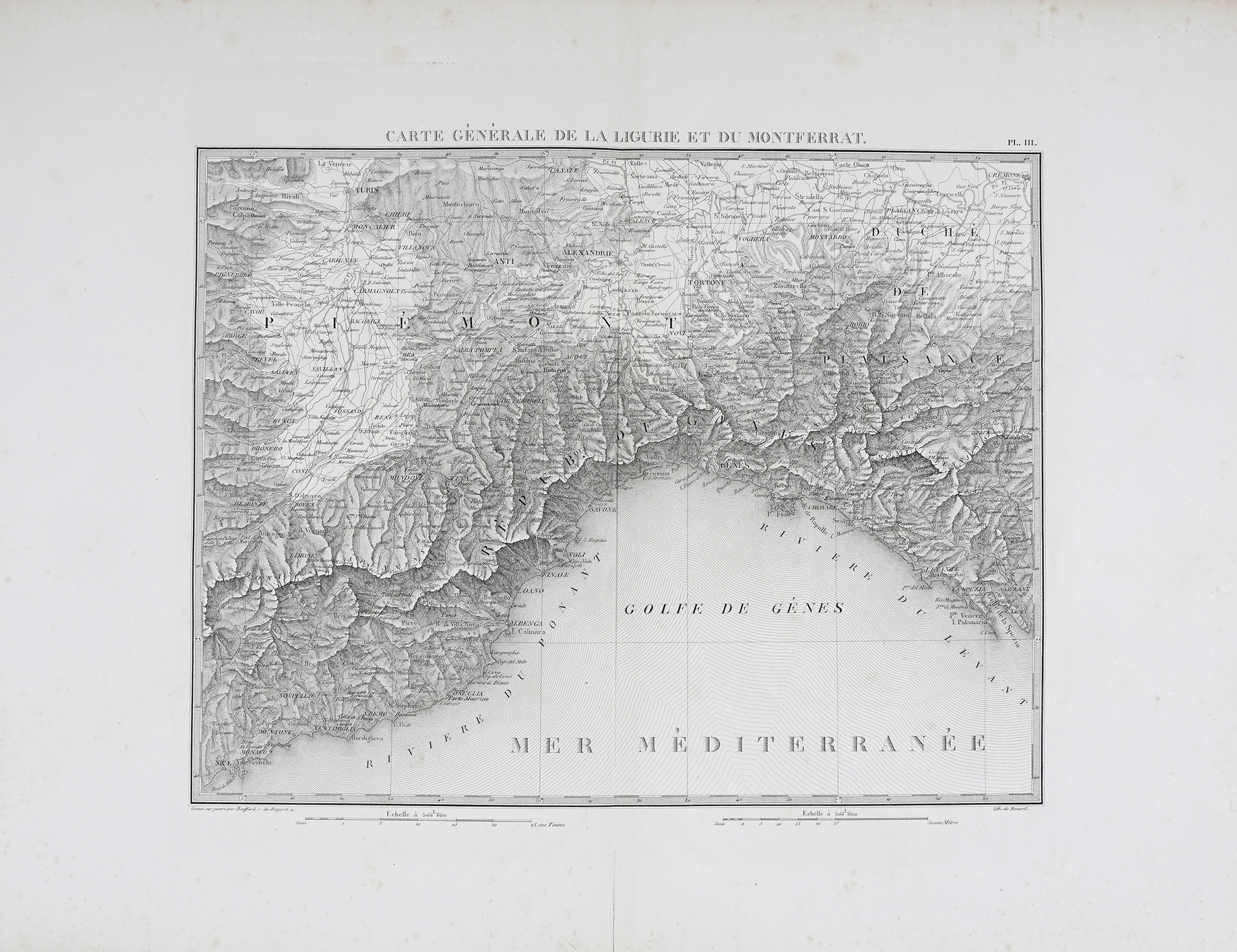 L. Bouffard, Carte générale de la Ligurie et du Montferrat. Paris: lith. Jean François Benard, s.d. [1850]. Litografia. mm 430x480. Foglio: mm 515x703. (1)