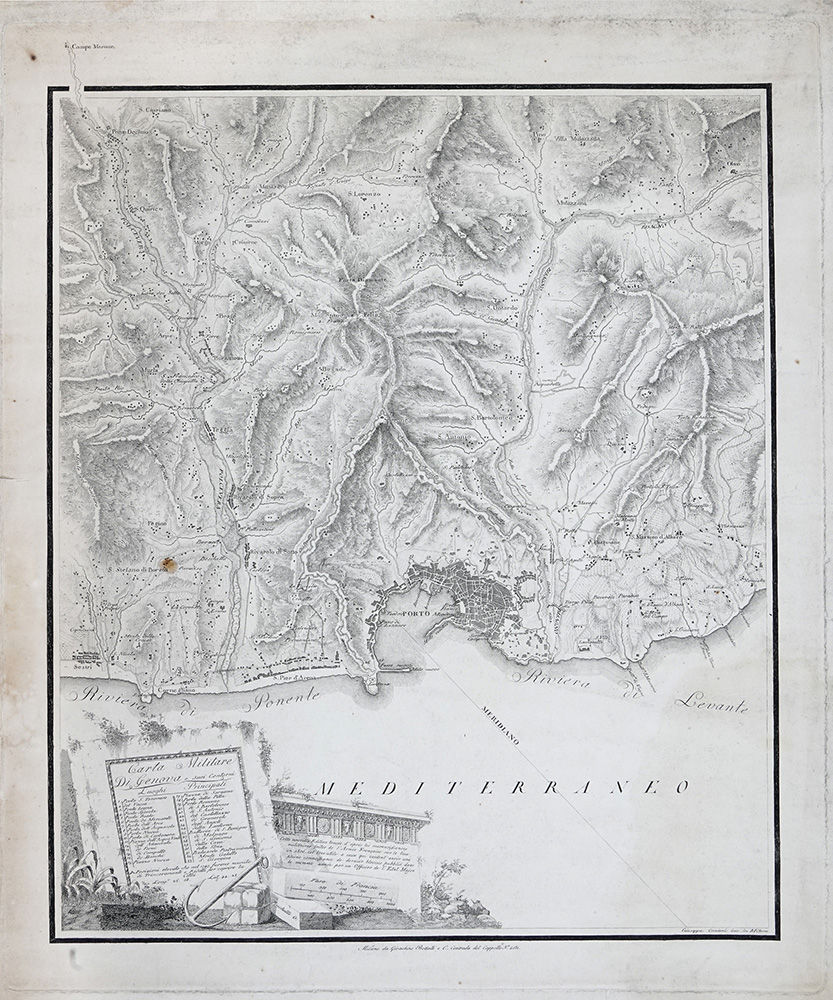 Giuseppe Caniani Giacomo Pinchetti, Carta militare di Genova e suoi contorni. Milano: Gioacchino Bettalli e C., 1825 ca. Incisione in rame. mm 587x490. Foglio: mm 637x530. Carta militare di Genova e dei suoi contorni da Sestri, Cornegliano e San Pier d'Arena nella Riviera di Ponente, fino a San Martino dell'Albaro nell'immediato entroterra della Riviera di Levante. All'interno si osservano Ponte Decino lungo il corso del Polcevera, Olmo lungo il corso del Bisagno. In basso al centro Genova con la sua cinta difensiva estesa fino al forte Sperone. (1)