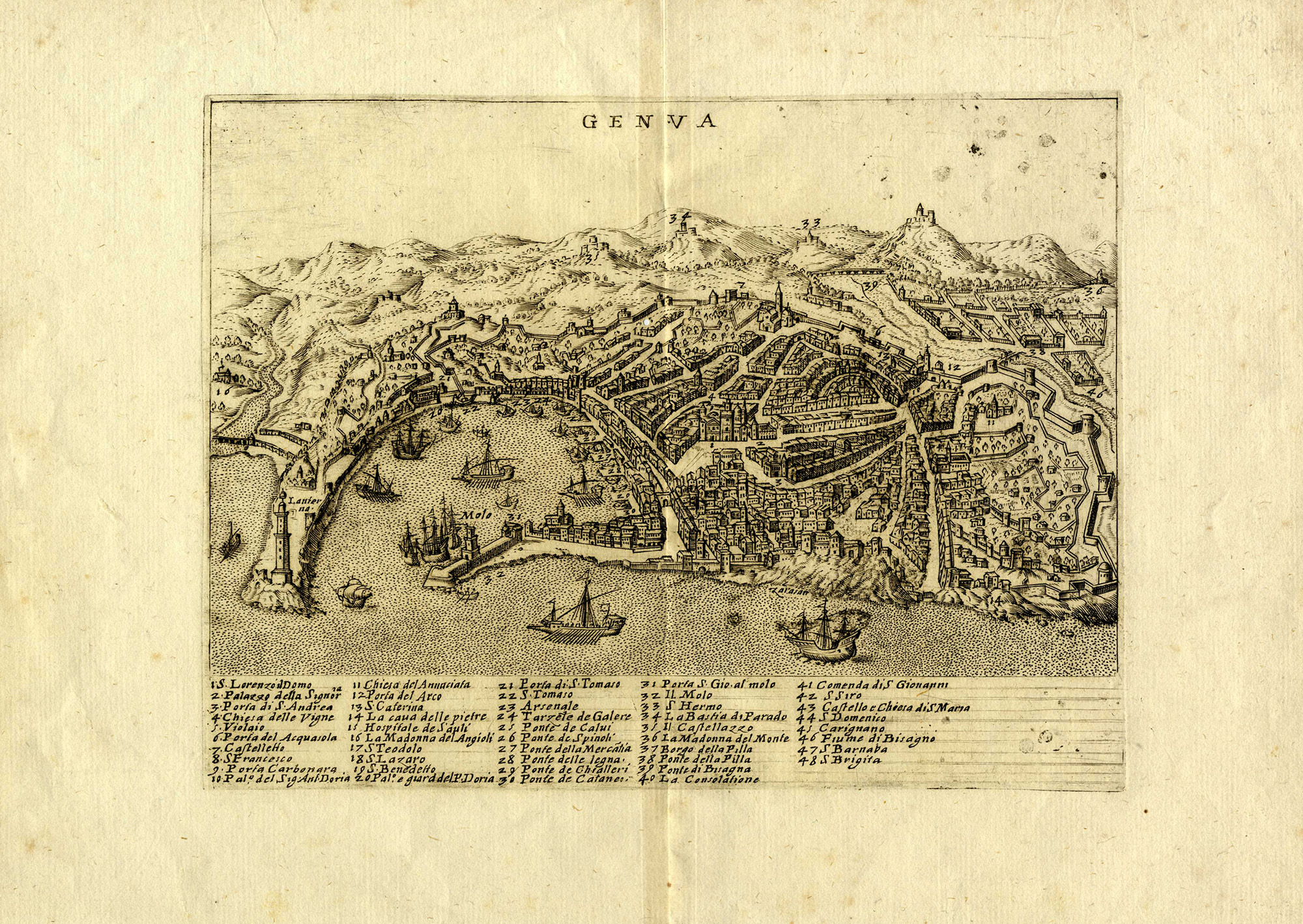 Giacomo Lauro, GENUA. 1642 ca. Bulino. mm 182x240. Foglio: mm 255x360. Da Heroico Splendore delle Città del Mondo, opera pubblicata per la prima volta a Roma nel 1639 e nuovamente nel 1642 con l'aggiunta di dieci nuove tavole. Veduta della città presa dal mare con in basso ricca legenda a 48 richiami per luoghi e monumenti di rilevante interesse. Bellissima impressione stampata con inchiostrazione piena e nitida su carta vergellata sottile priva di filigrana. Al margine inferiore evidenti linee per allineamento della lettera. (1)