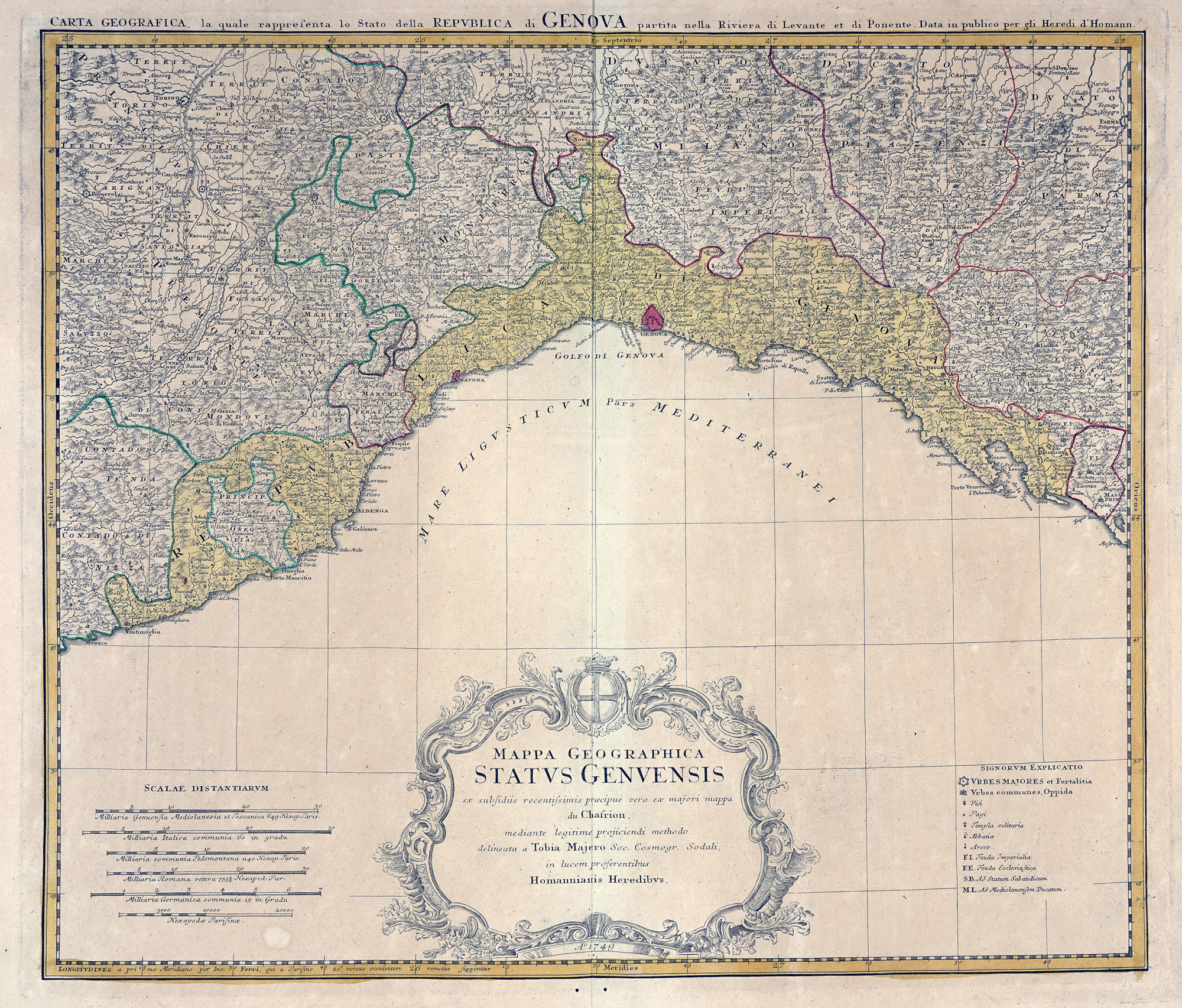 Tobias Mayer, Mappa geographica status Genuensis ex subsidiis recentissimis præcipue vero ex majori mappa du Chafrion. Nürnberg: Hommanianis Heredibus, 1749. Incisione in rame in coloritura. mm 495x580. Foglio: mm 538x640. Grande mappa geografica dello Stato Genovese, dall'Atlas Compendiarius: Quinquaginta Tabularum Geographicarum Homannianarum alias in Atlante maiori contentarum edito dagli Eredi Homann a Norimberga. Il colore giallo evidenzia l'estensione della Repubblica di Genova, in basso al centro è posizionato il titolo entro cartiglio a forma di conchiglia con in alto le armi della città. Al margine superiore oltre la bordura gialla si legge: CARTA GEOGRAFICA, la quale rappresenta lo Stato della REPUBBLICA di GENOVA partita nella Riviera di Levante et di Ponente. Data in pubblico per gli Heredi d'Homann. (1)