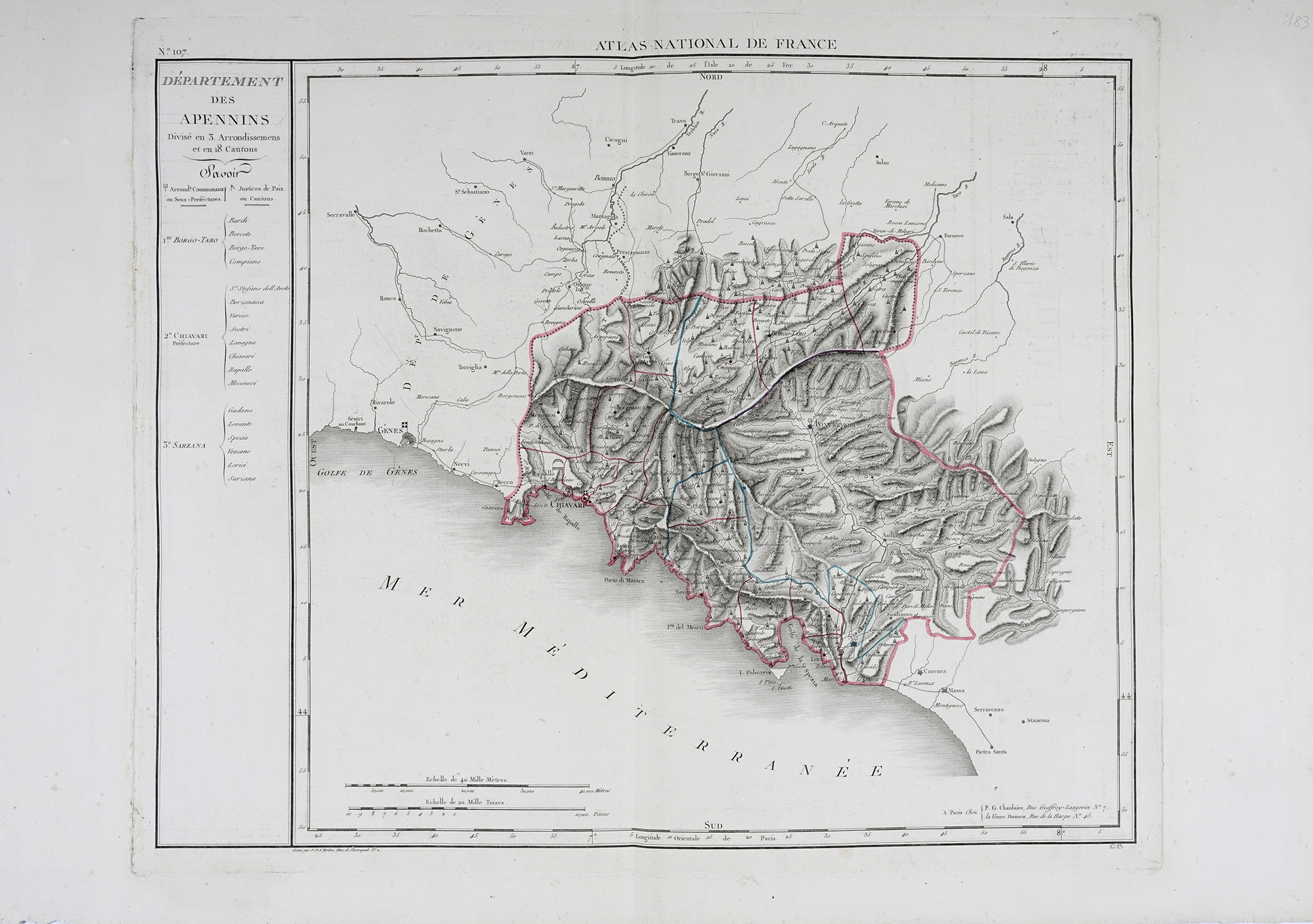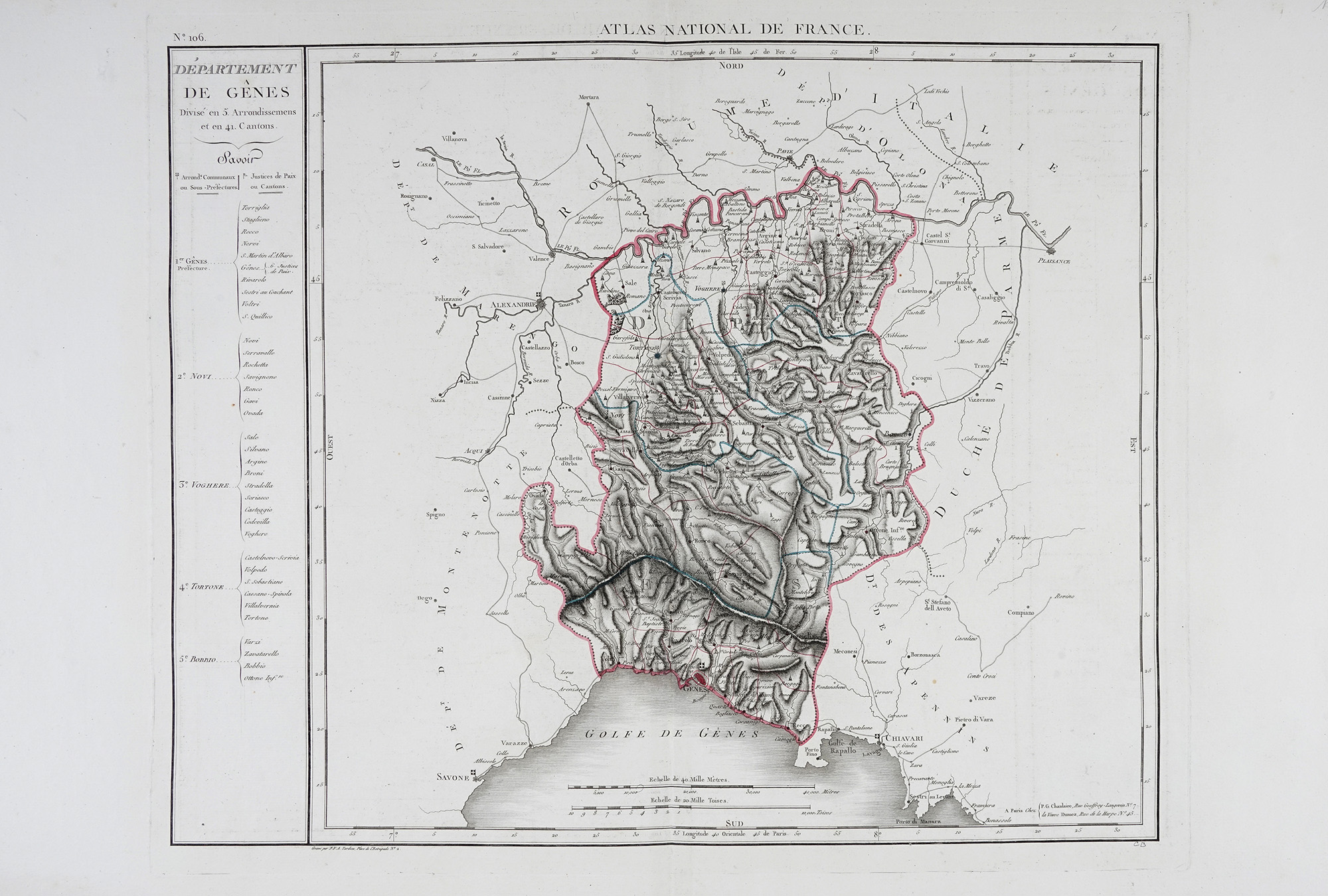Pierre Antoine-François Tardieu (Tardieu de l'Estrapade), Département de Gênes Divisé en 5 Arrondissemens et en 41 cantons (N° 106 et N°107). A Paris Chez P.G. Chanlaire, 1790-1811.