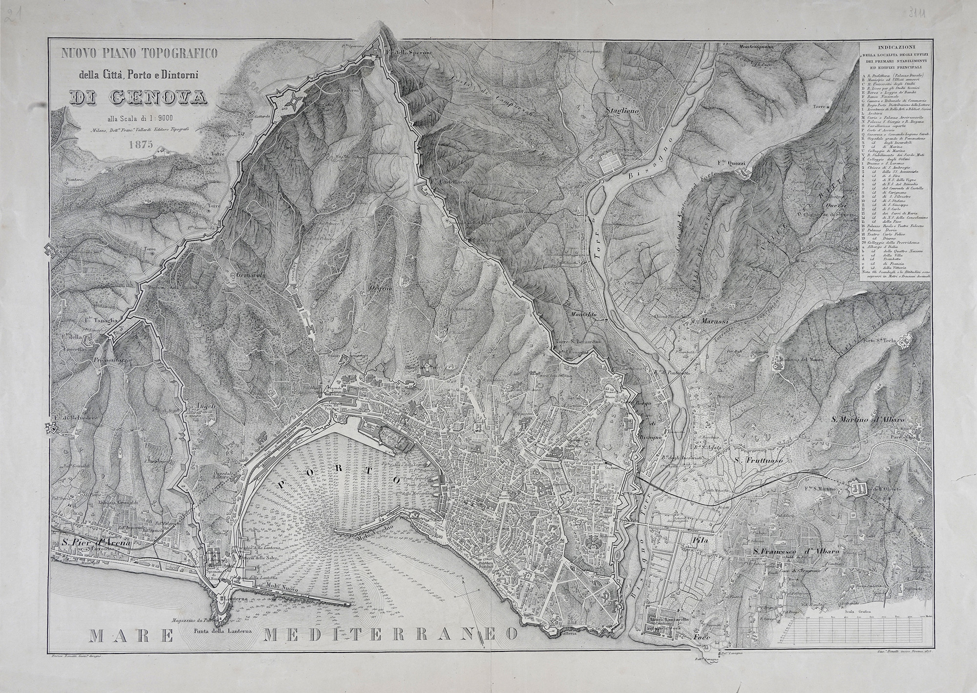 Pierre Antoine-François Tardieu (Tardieu de l'Estrapade), Département de Gênes Divisé en 5 Arrondissemens et en 41 cantons (N° 106 et N°107). A Paris Chez P.G. Chanlaire, 1790-1811. Incisione in rame con confini in coloritura. mm 520x620. Foglio: mm 575x840. Dall' Atlas Nationale de France di Pierre Gregoire Chanlaire (1758 - 1817). Due mappe del dipartimento di Genova, sotto l'amministrazione francese dal 1805 al 1814. SI AGGIUNGE: Enrico e Giuseppe Bonatti. Nuovo piano topografico della Città, Porto e dintorni di Genova. Milano, Vallardi 1875. Incisione in rame. mm 525x752. Foglio: mm 600x840. (3)