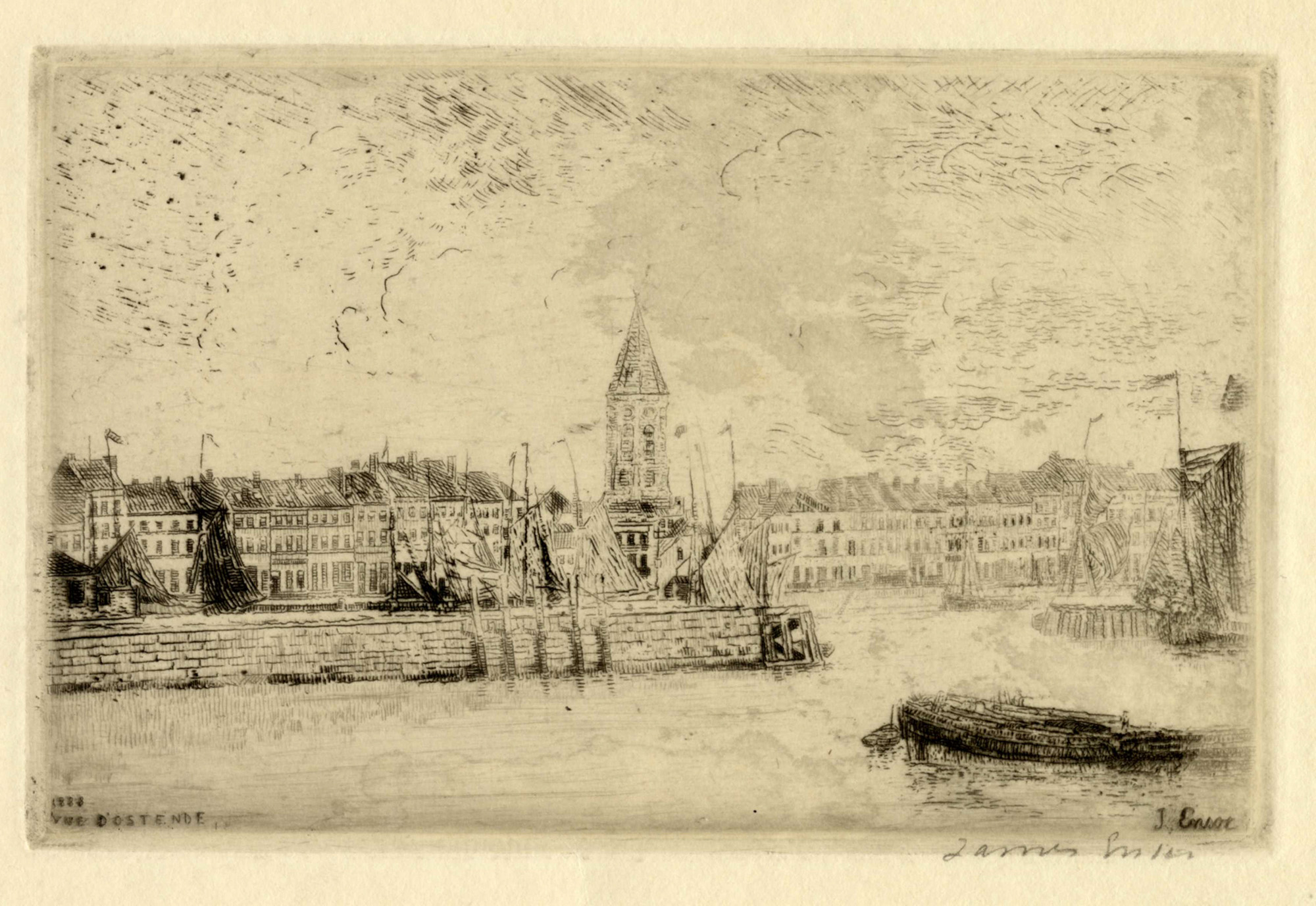 James Ensor, Vue d' Ostende. 1888. Acquaforte su carta avorio. mm 88x135. Foglio: mm 160x250.croquez, 40. Firma a matita in basso a destra, controfirma in lastra in basso a destra e data e luogo sempre in lastra in basso a sinistra. Esemplare nel III stato di 3. (1)