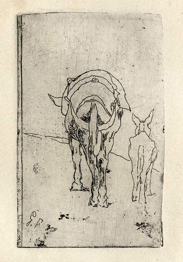 Giovanni Fattori, Due somarelli. Acquaforte su zinco. mm 113x70. Foglio: mm 313x270. baboni-malesci,, VI. Siglata in lastra in basso a sinistra. (1)