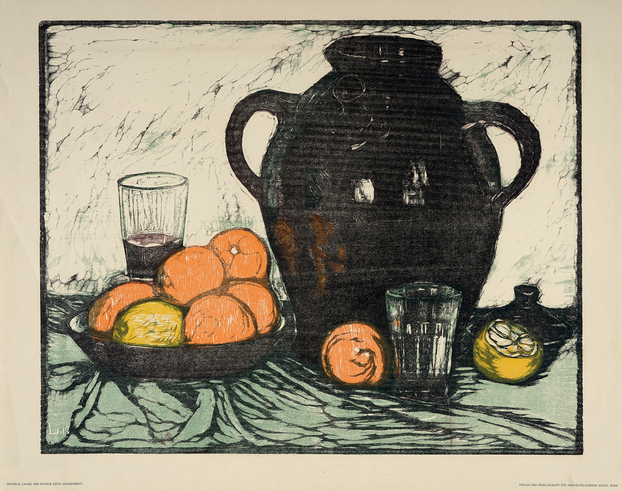 Wilhelm Laage, Der dunkle Krug. 1917. Xilografia a colori. mm 400x500. Foglio: mm 460x580. Siglata e datata "L 17" nella matrice in basso a sinistra. Iscrizioni tipografiche in basso. Edita da Gesellschaft für vervielfältigende Kunst, Wien. (1)