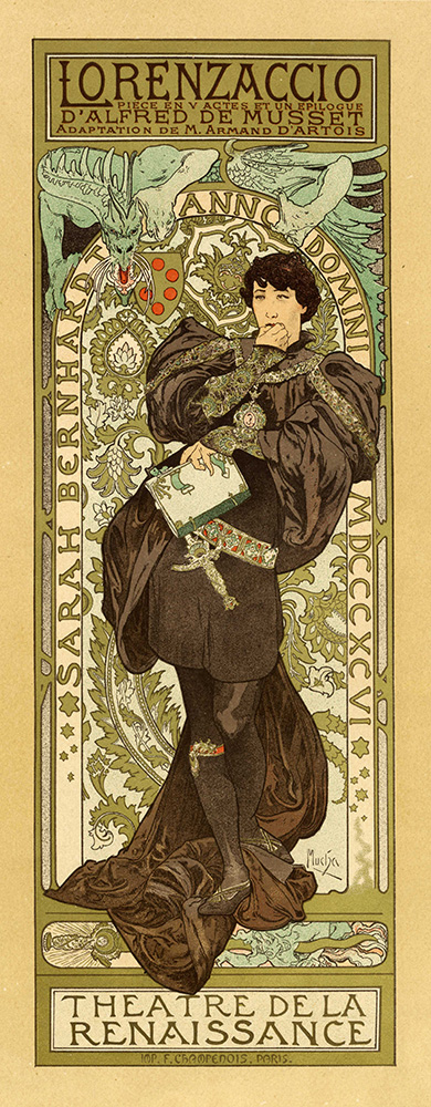 Alphonse Mucha, Lorenzaccio. 1896. Litografia a colori. mm 325x115. Foglio: mm 395x290. Firma in lastra in basso a destra, titolo in alto. Timbro a secco de "Les Maitres de l'affiche" in basso a destra, dati editoriali e numero di tavola in basso a sinistra. Celebre manifesto dalla pubblicazione periodica "Les Maitres de l'affiche" (tav. 114, 1898), realizzato da Mucha nel 1896 per l'opera teatrale Lorenzaccio di Alfred de Musset il cui testo fu adattato da Sarah Berhardt, interprete principale nel ruolo maschile di Lorenzo de' Medici. (1)