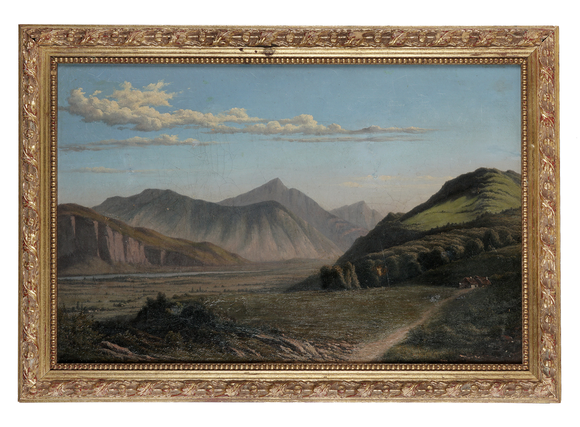 Karl Bodmer, Le montagne. Olio su tela. cm 41x64. Firma in basso a sinistra. Al verso timbro de "Brullon Paris...". (1)