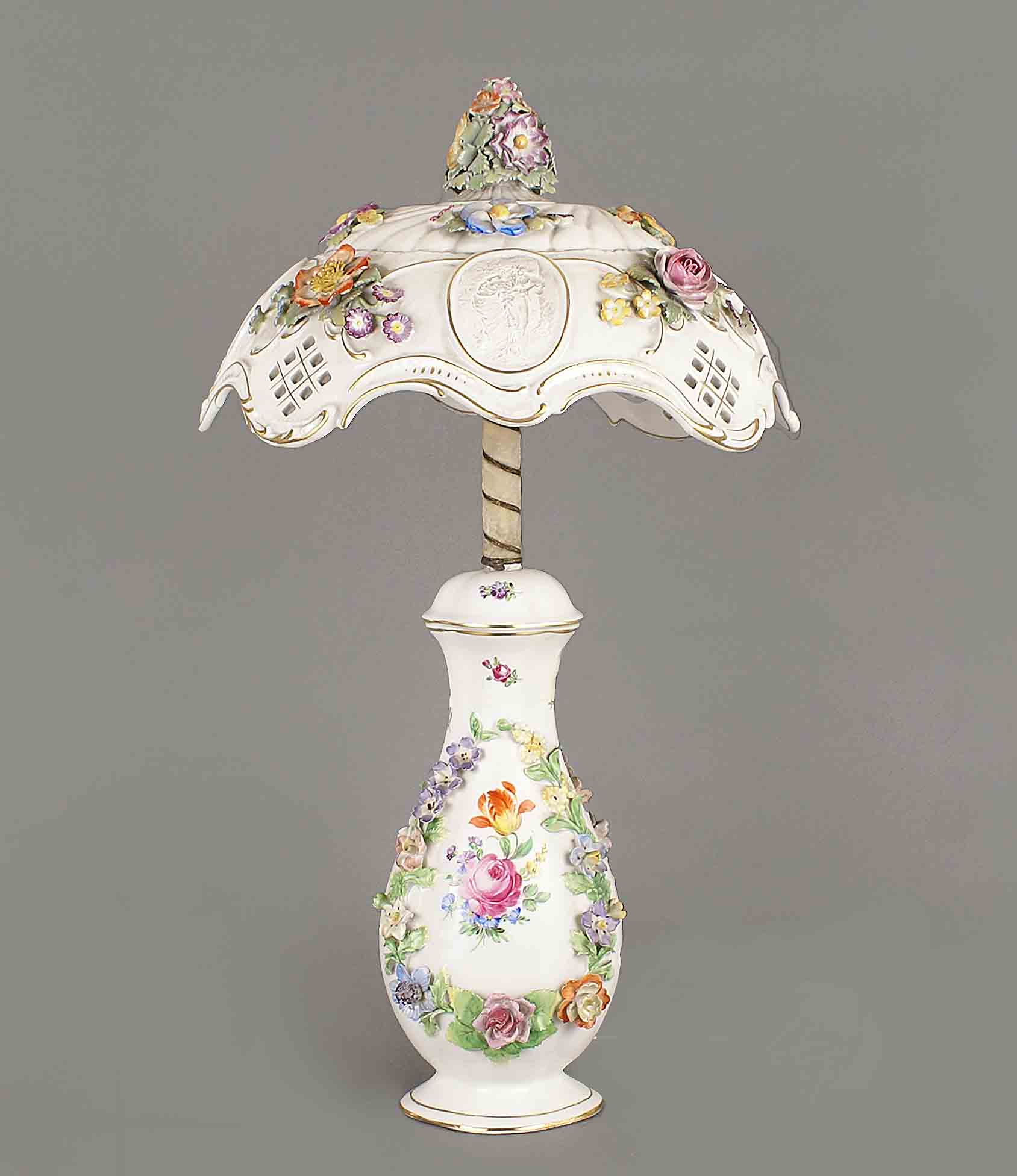 Particolare lampada da due gruppi in porcellana policroma decorata con fiori in rilievo e quattro placche in biscuit, Dresda, vecchia manifattura, h. cm. 48, (lievi difetti).
