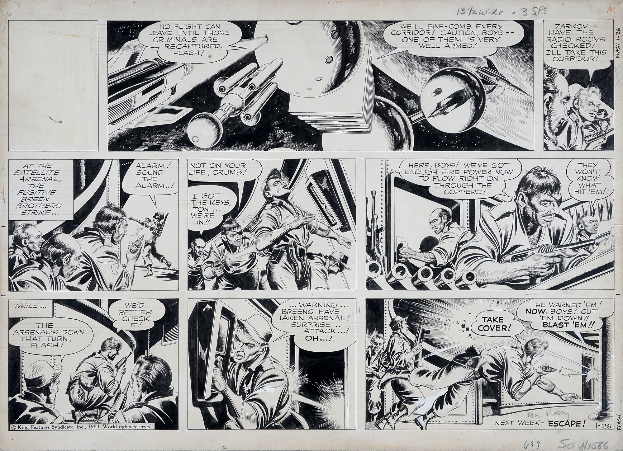 Emmanuel Mac Raboy, Tavola fumettistica per Flash Gordon. 1964. Incisione con parti colorate a mano a penna e inchiostro di china su carta. mm 366x506. Firma a matita in basso a destra, sotto il codice "50.HI586" e in alto a destra "13'/2WIDE-3SPS". Al margine destro a penna e inchiostro di china "Flash 1-26". In basso a sinistra applicato la targhetta con "© King Features Syndicate, Inc, 1964. World rights reserved". (1)