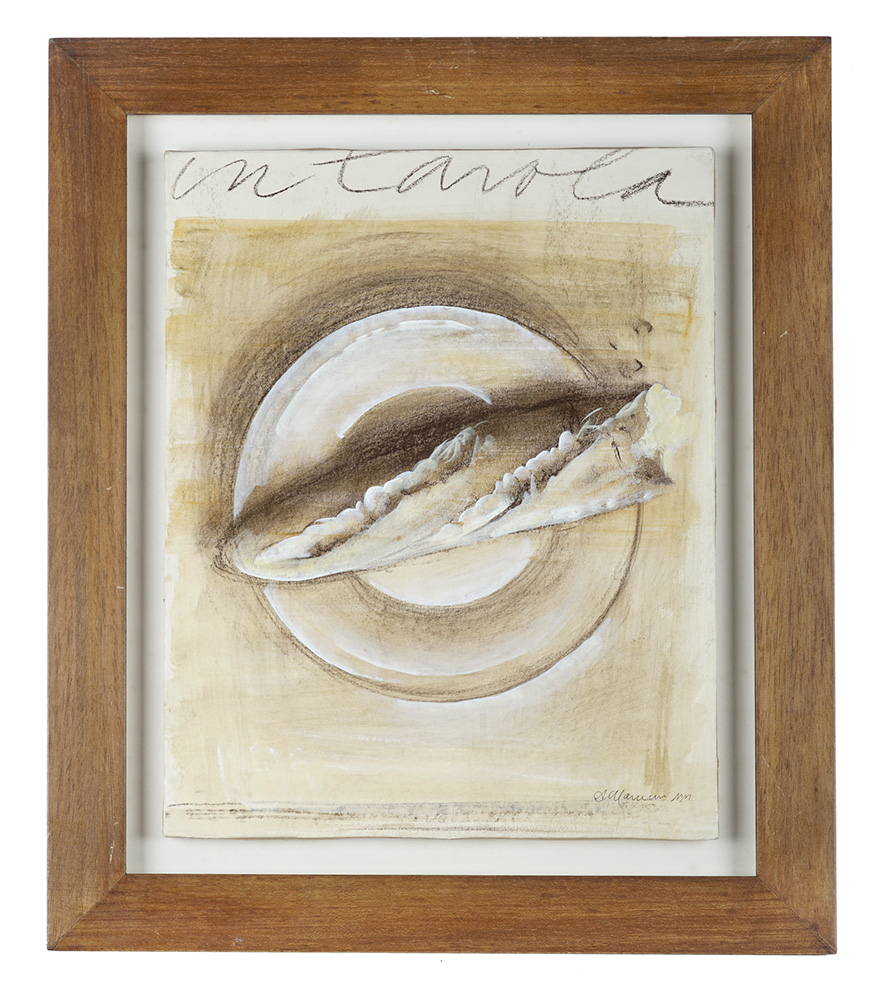 Andrea Mancini, In tavola. Acquerello e carboncino su carta. mm 450x350. Firmato in basso a destra a penna e inchiostro di china e titolato in alto al centro. Al verso targhetta di autenticità dell'opera con controfirma dell'artista. (1)