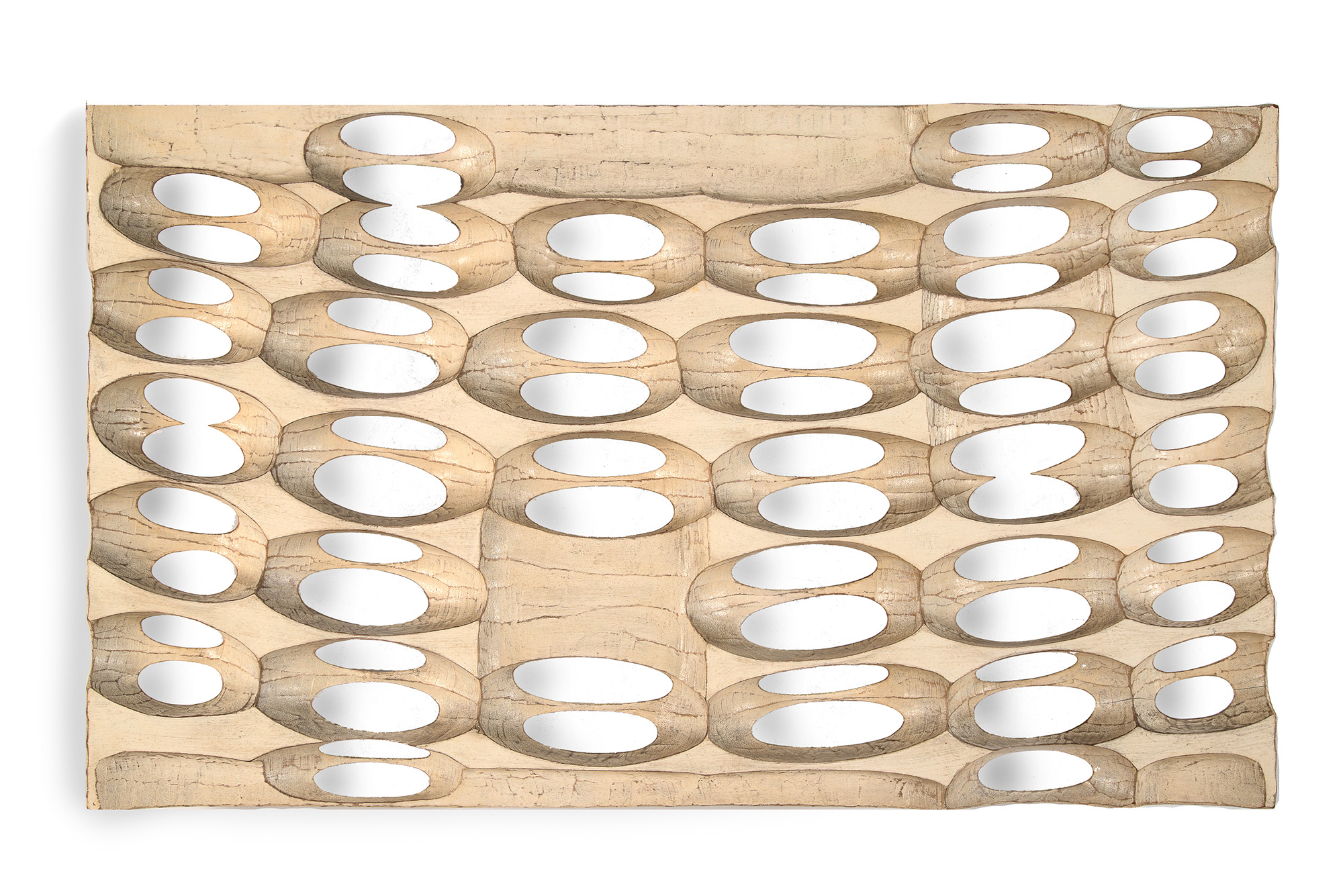 Tomonori Toyofuku, Untitled. 1969. Legno scolpito e dipinto e piedini in ferro. cm 100,5x59,5x13. Firma e data incisi al margine sinistro del verso. L'artista studia la sua originale espressione astratta manifestandola nelle sculture di bronzo, legno di mogano o pietra traforate ripetendo un motivo ovoidale infinite volte, con infinite variazioni; ha creato gioielli e monumenti pubblici, come per esempio la fontana in granito a Kurume (1983) e la scultura commemorativa in ferro nel porto di Fukuoka (1997). Il suo lavoro è incentrato sulla ricerca di una tridimensionalità ottenuta come processo di sottrazione puntuale. Le compatte masse lignee, dominate da una forte orizzontalità o verticalità, si mostrano attraverso l'ingannevole sembianza delle loro superfici planari, sulle quali però trovano spazio una fitta trama di concavità ovaliformi che finiscono per svelare la natura tridimensionale della materia. Queste "porosità" si addensano e infittiscono a tal punto da riuscire ad erodere i pesanti volumi di materia che a questo punto si trovano ad essere espressioni di trame e ritmi del tutto inattesi. Con il passare del tempo ai lavori su legno si aggiungono interventi ottenuti per fusione di bronzo, per traforatura della pietra e di materie plastiche, secondo un processo di semplificazione che lo porterà a raggiungere un notevole grado di monumentalità. Le sculture di Toyofuku fanno ormai parte delle più importanti collezioni pubbliche e private; si trovano al Museum of Modern Art di New York, al National Museum of Modern Art di Tokyo, alla Albright-Knox Art Gallery di Buffalo e alla Galleria d'Arte Moderna di Roma. (1)