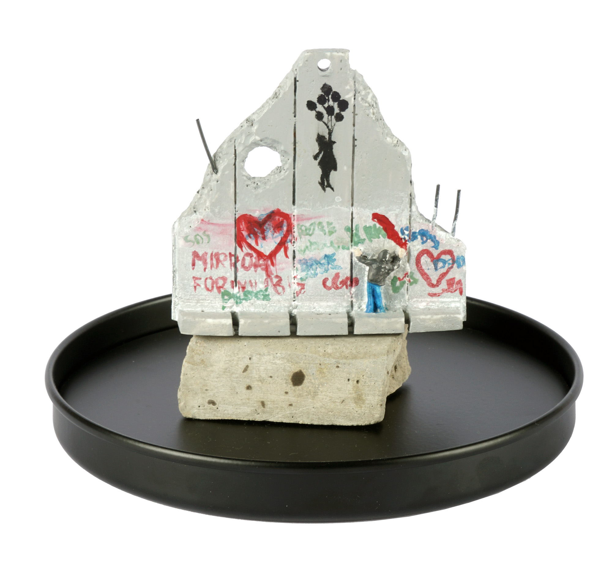 Banksy, The Walled Off Hotel. Five-part souvenir wall section (Flying girl with baloon). 2017. Resina dipinta. cm 9x9,5x2,7. Sotto, a matita, riportato il numero "1000107" della ricevuta che accompagna l'opera, con timbro a secco in basso a sinistra e a inchiostro rosa al margine destro del biglietto. Il souvenir è applicato, non in modo definitivo, a una piccola porzione di muro. Il tutto è conservato in una bella teca di vetro. (1)