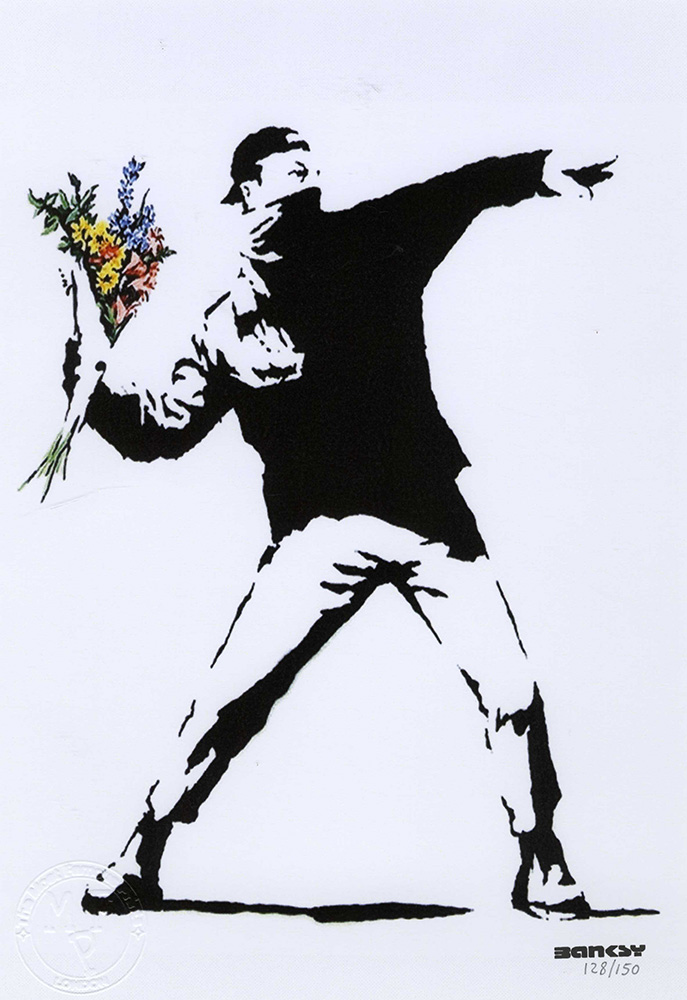 Banksy [da], Flower Thrower. Offset. mm 300x205. Firma in lastra in basso a destra; sotto, a matita, la tiratura e in basso a sinistra timbro a secco dell'editore londinese. Es. 128/150. (1)