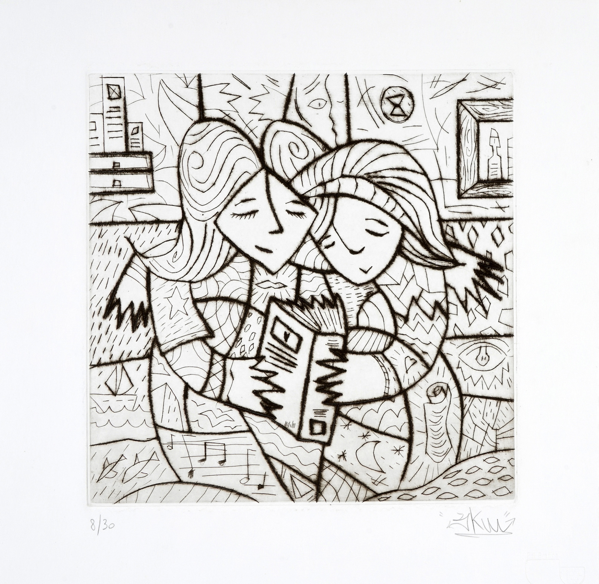 Skim [pseud. per Forconi Francesco], La lettura. Acquaforte. mm 250x245. Foglio: mm 350x350. Firmata a matita in basso a destra e numerata in basso a sinistra. Timbro a secco de "Edi Grafica Edizioni d'Arte Firenze" in basso a sinistra. Es. 8/30. (1)