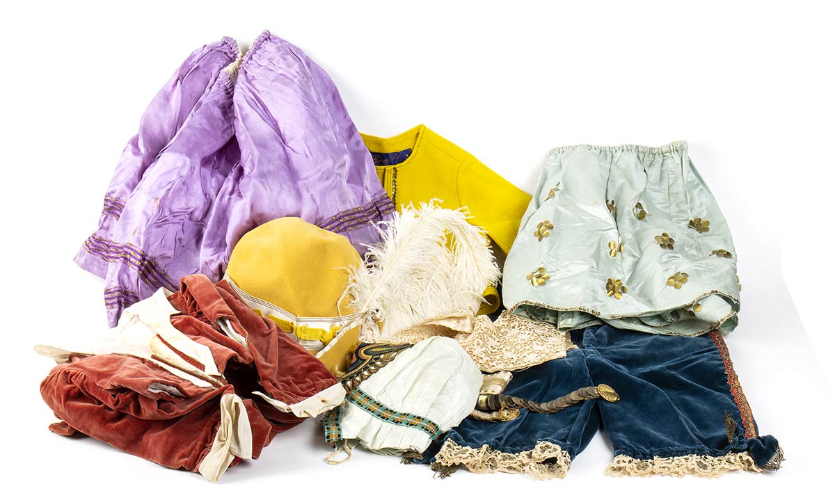 AbitoScatola contenente abitini di carnevale per bambini anni 30/40, grado di condizione generale C/D (segni del tempo, macchie, strappi)