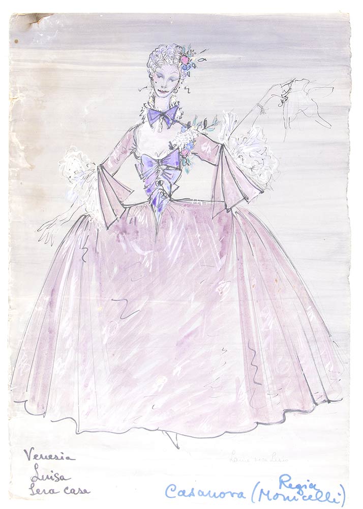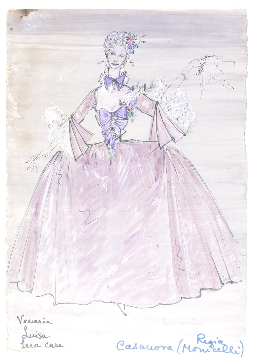 De Matteis, Maria (1912 - 1988)Bozzetti per costume teatraleLotto di due bozzetti per costumi dello spettacolo teatrale CASANOVA per la regia di Mario Monicelli. Abiti da donna settecenteschi, per Luisa e IreneCondizioni mediocri, macchie, danni e mancanze alla carta. Misure circa cm. 45x35
