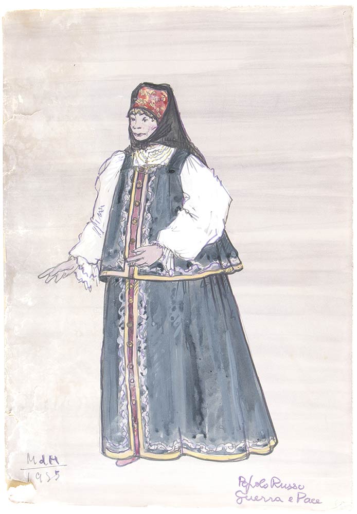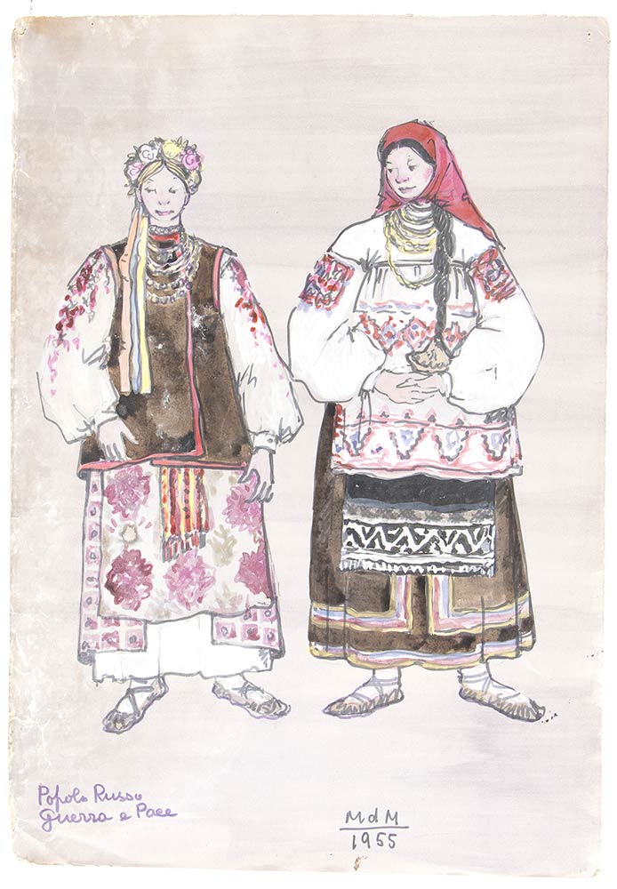 De Matteis, Maria (1912 - 1988)Bozzetti per costume teatraleLotto di due bozzetti per costumi dello spettacolo teatrale GUERRA E PACE , per il popolo russo. Firmati MDM 1955Condizioni mediocri, macchie, danni e mancanze alla carta. Misure circa cm. 45x35
