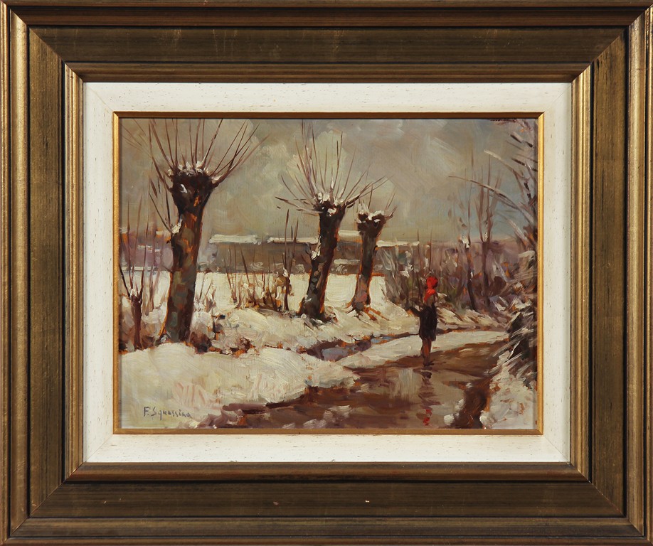 SQUASSINA GIACOMO FRANCESCO (n. 1932) Inverno. Olio su tela . Cm 70,00 x 50,00. Firma in basso a sinistra. Cornice presente