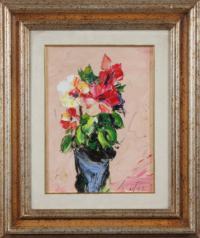 SCATIZZI SERGIO (1918 - 2009) Fiore. Olio su tavola. Cm 30,00 x 40,00. Firma in basso a destra e al retro. Autentica dell' artista su fotografia. Cornice presente