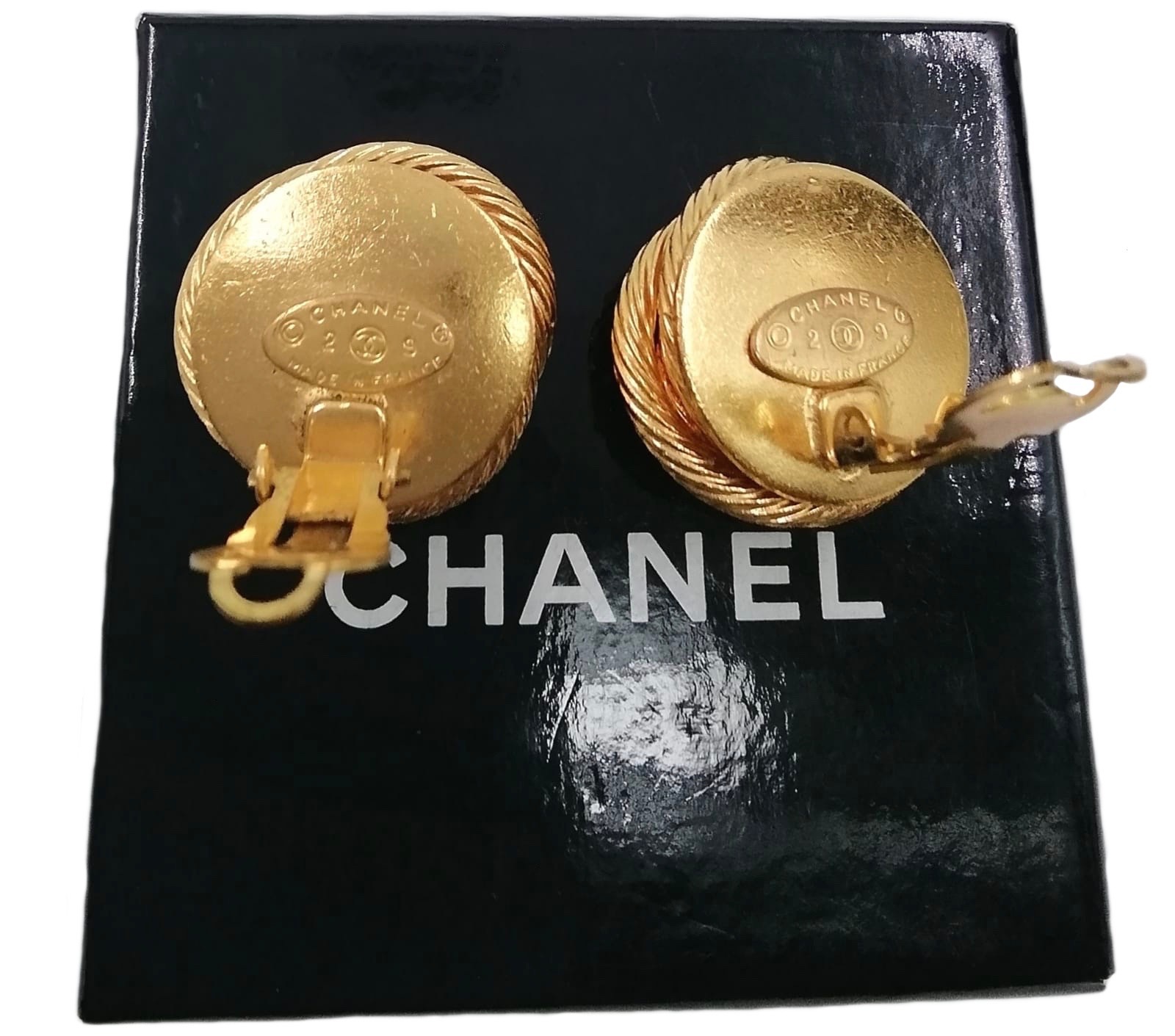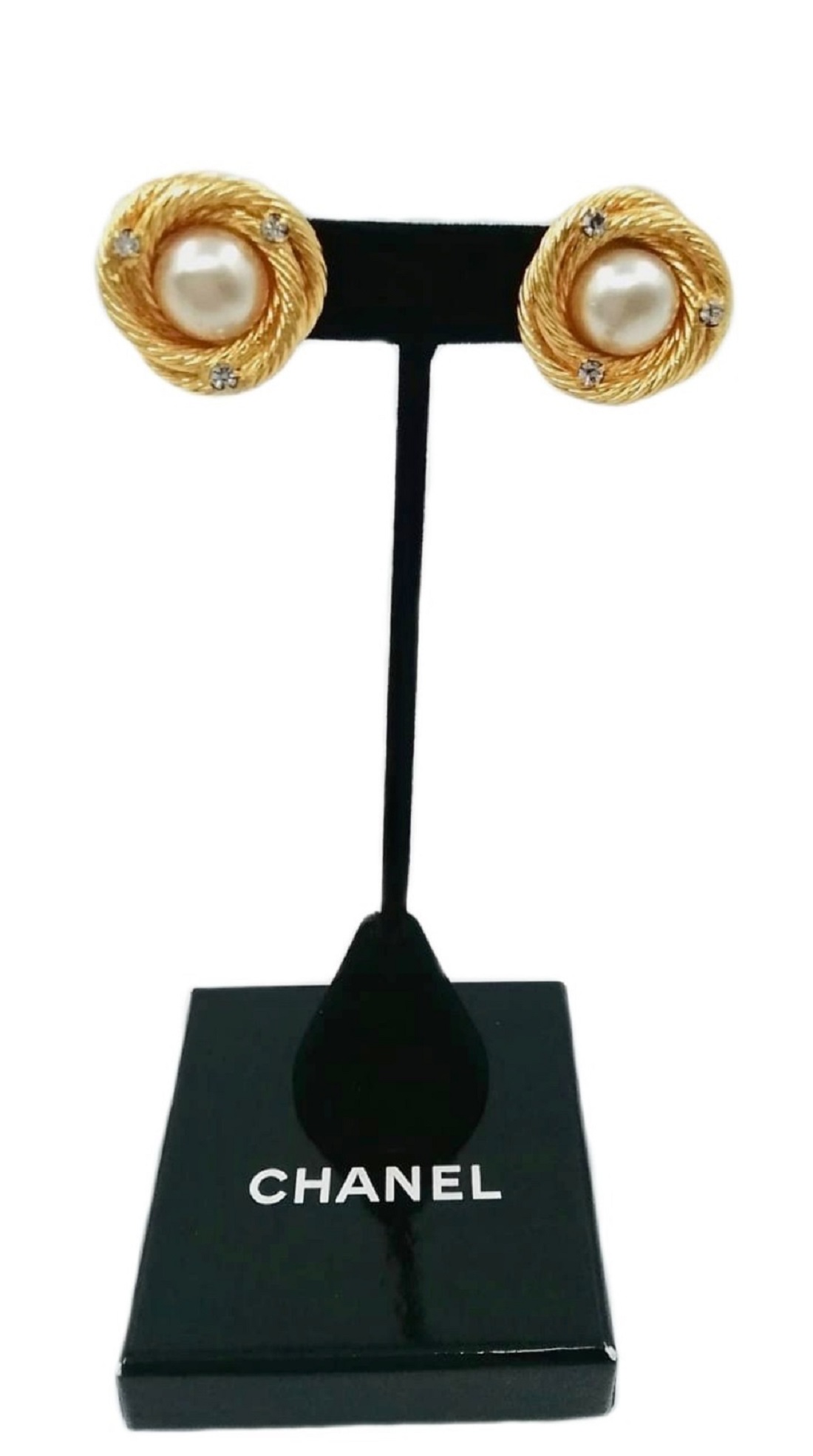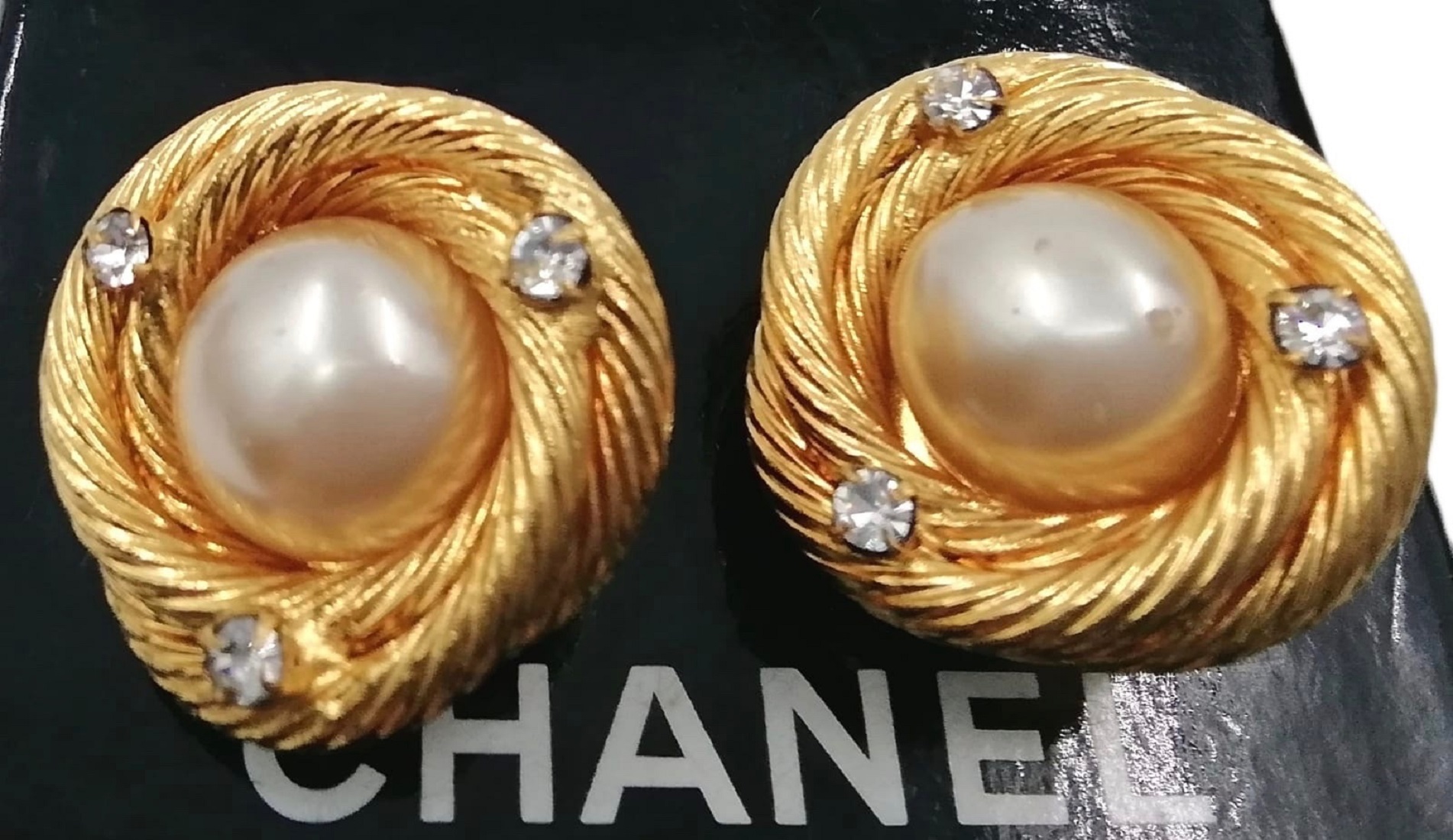 CHANEL Orecchini a lobo con clips. 1990. Metallo dorato e perla.. Cm 2,50 x 2,70. Nido con finta perla centrale e cristalli. 1990 circa. Ottime condizioni, lievi segni sulle perle. Con scatola originale e punzone Chanel all'interno.