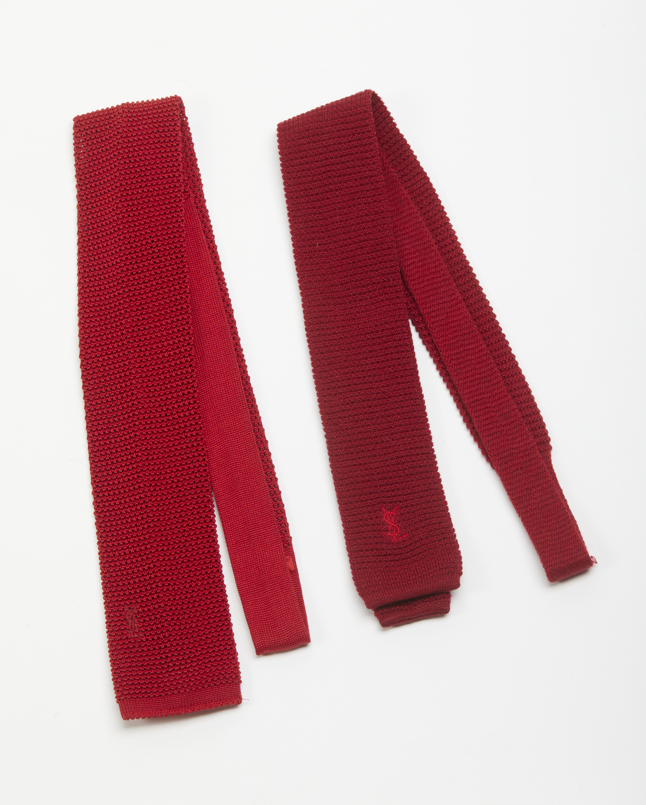 SAINT LAURENT YVES Due cravatte. Lana e seta. . Una cravatta in maglia operata rosso ciliegia, lunghezza piegata a metà 70 cm, larghezza 7 cm, etichetta tessile 100% seta, logo YSL ricamato ton sur ton; una cravatta in maglia rosso borgogna, lunghezza piegata a metà 65 cm, larghezza 6 cm, etichetta tessile 100% lana, logo YSL ricamato ton sur ton.