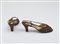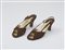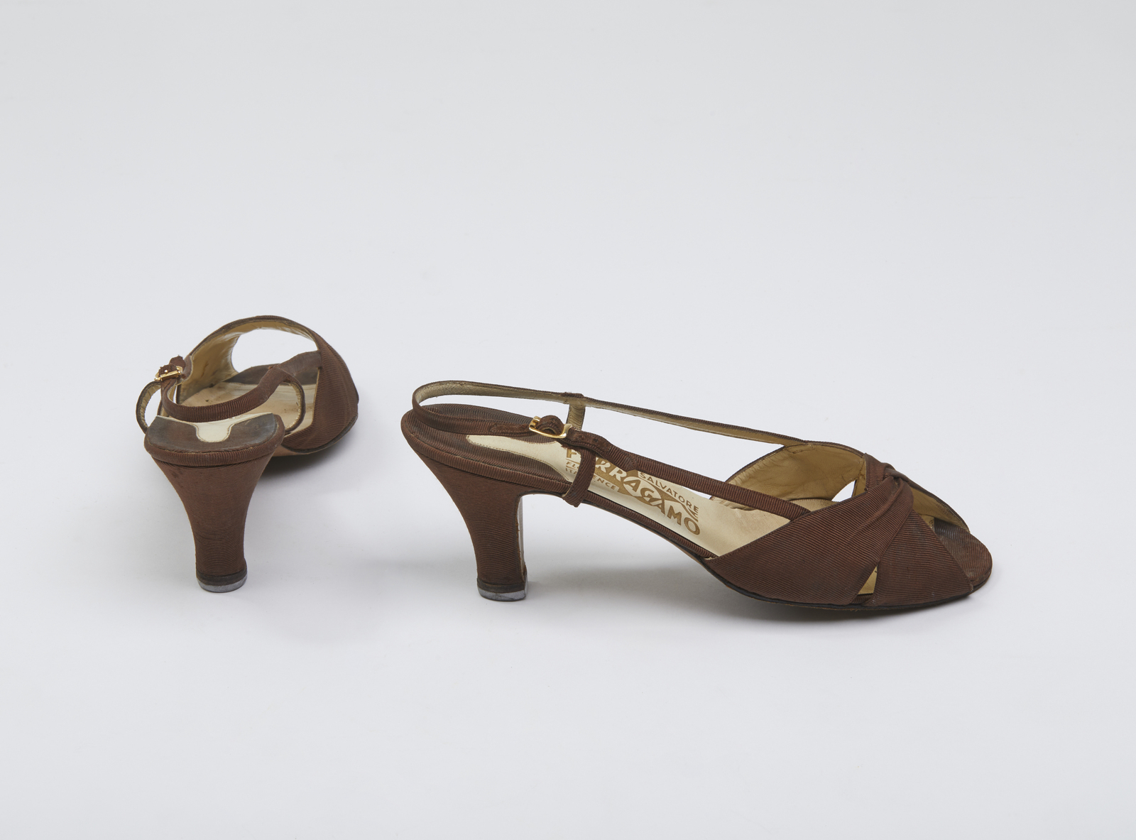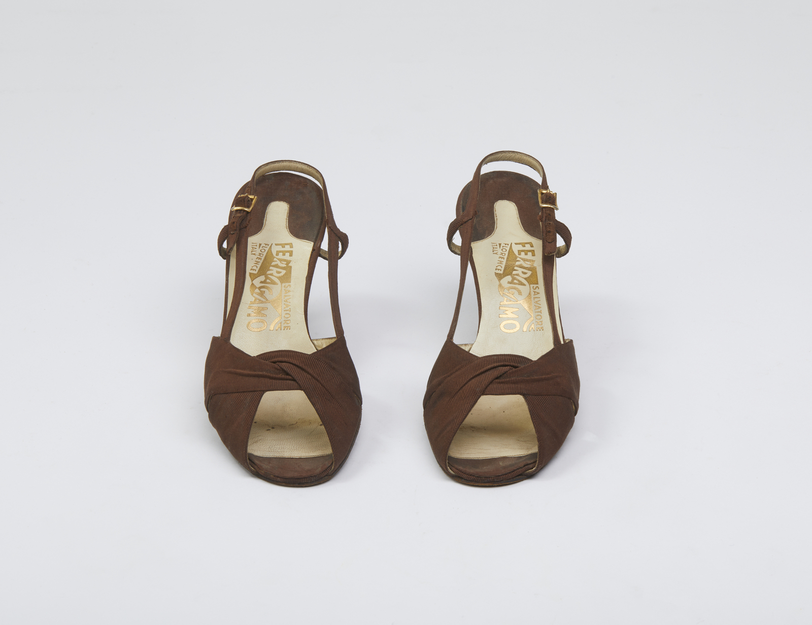 FERRAGAMO SALVATORE Sandali testa di moro. 1950. Faille taffetà rigato. Cm 6,00 x 12,00 x 24,00. Sandalo testa di moro, numero 37. Fine anni 50'. Tacco cm 6.5, in faille taffetà rigato di seta. Condizioni eccellenti, valore museale, da archivio.