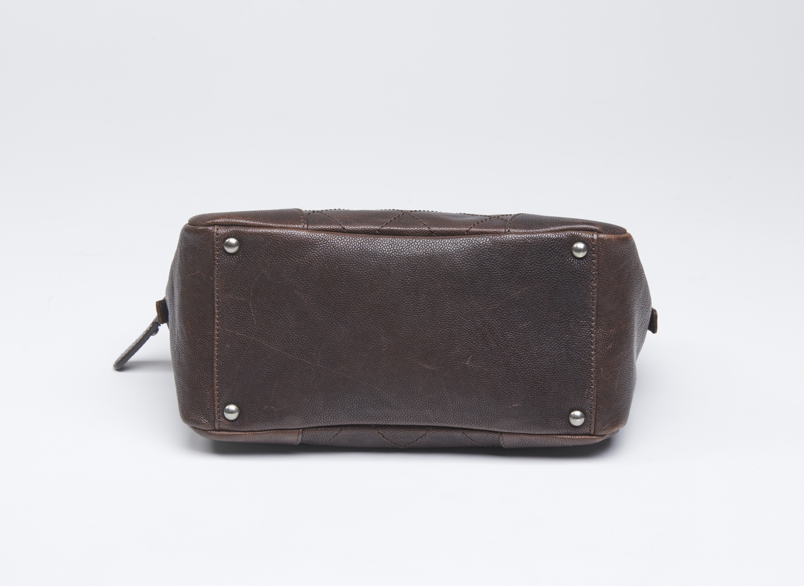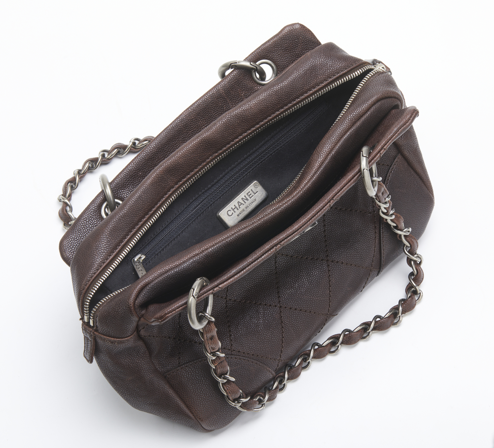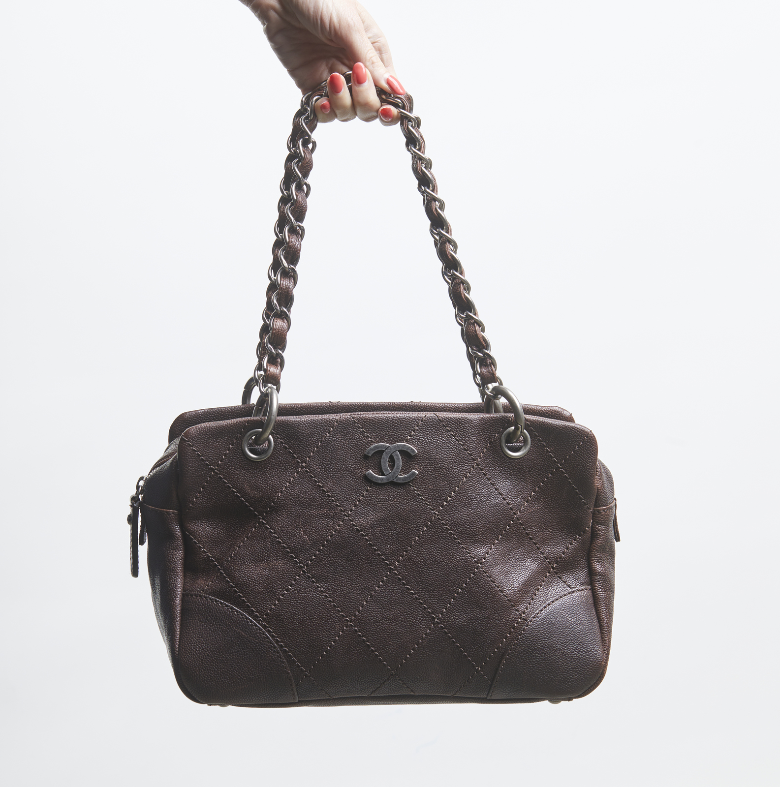 CHANEL Chanel CC Outdoor ligne, borsa a spalla in pelle marrone. 2005. Pelle. Cm 28,00 x 18,00 x 12,00. Borsa a spalla in pelle caviar marrone Chanel vintage, CC Outdoor ligne, dettagli hardware color argento brunito,tracolla a catena e pelle, chiusura a zip e logo CC sul fronte. Dustbag e scatola presente. Piccoli graffi, patina.
